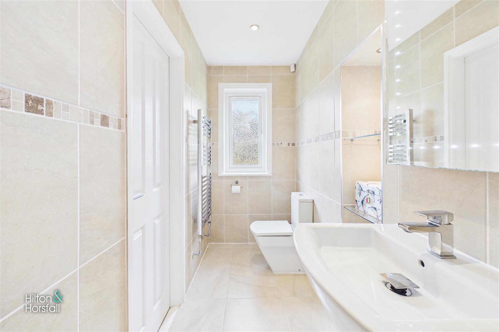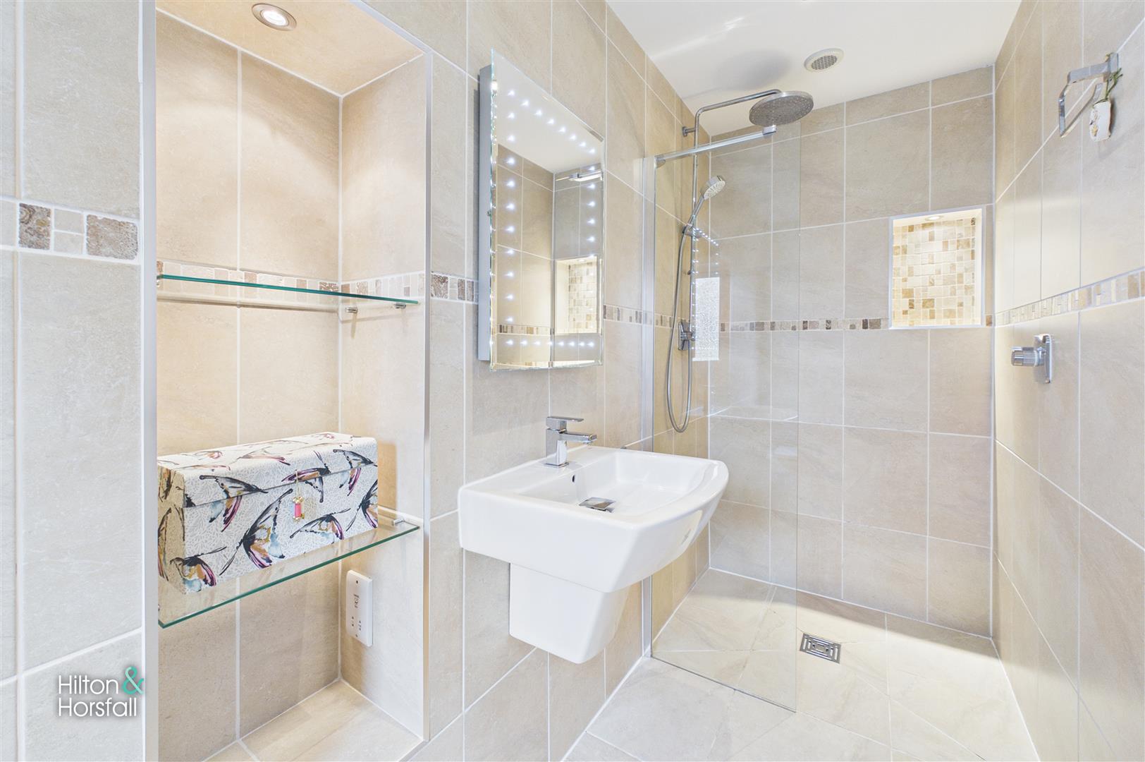 A contemporary and well-appointed en-suite shower room finished with stylish tiled walls and flooring, creating a sleek and modern feel. The suite comprises a walk-in shower with rainfall shower head and glass screen, wall-mounted wash basin with chrome mixer tap, low-level WC and a heated chrome towel radiator. Additional features include recessed ceiling lighting and a frosted uPVC double glazed window, providing both natural light and privacy.