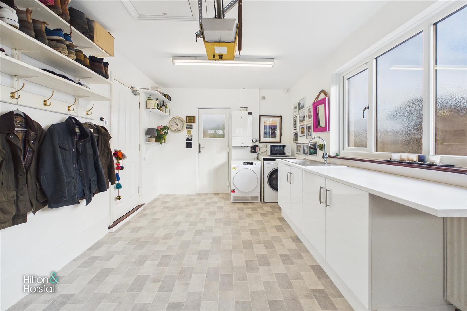 A superb and highly versatile integral garage offering excellent additional space, currently arranged to incorporate a practical utility area. Fitted with a range of base units, work surfaces and sink, the room provides ample space and plumbing for laundry appliances, along with extensive storage solutions. The garage benefits from internal access to the kitchen, an up-and-over garage door to the front, and a further door leading directly out to the rear garden, making it an incredibly useful space for everyday family living.