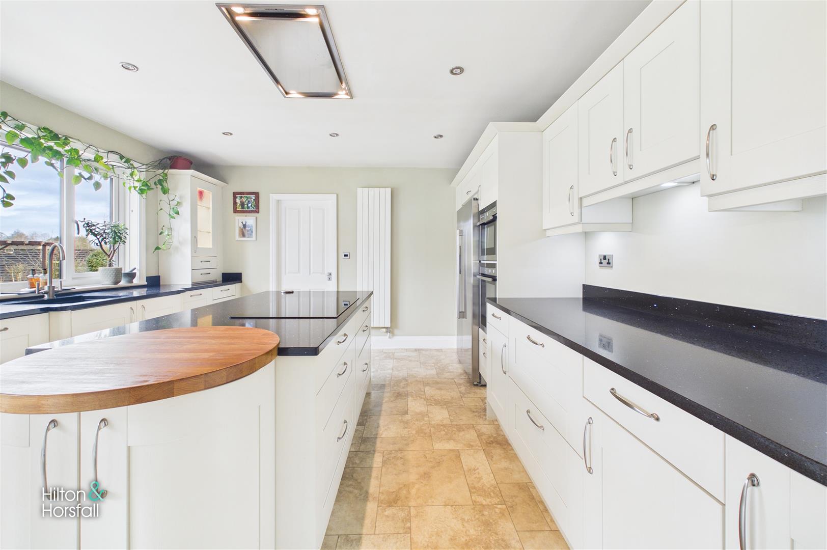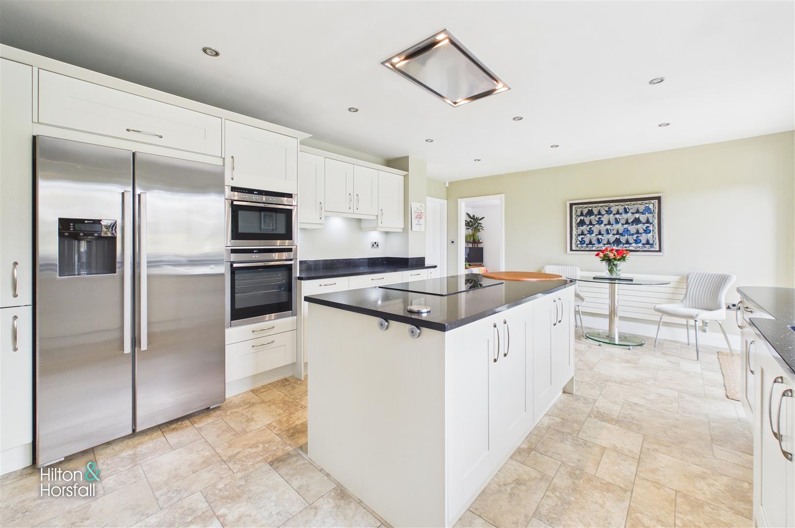 A superb and stylish dining kitchen positioned to the rear of the property, fitted with a comprehensive range of cream wall and base units complemented by granite work surfaces and under-unit lighting. The kitchen is centred around a generous island with additional storage, incorporating a Neff four-ring induction hob with integrated extraction, along with Neff oven, grill and dishwasher, and ample space for an American-style fridge/freezer. Finished with tiled flooring, recessed spot lighting and a Blanco under-mounted sink with chrome mixer tap, the space also offers plenty of room for a dining table and chairs. Large uPVC double glazed windows and a sliding patio door provide excellent natural light and direct access to the rear garden, with further access through to the integral garage.