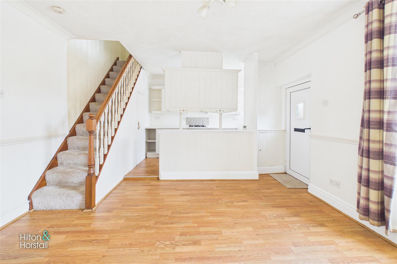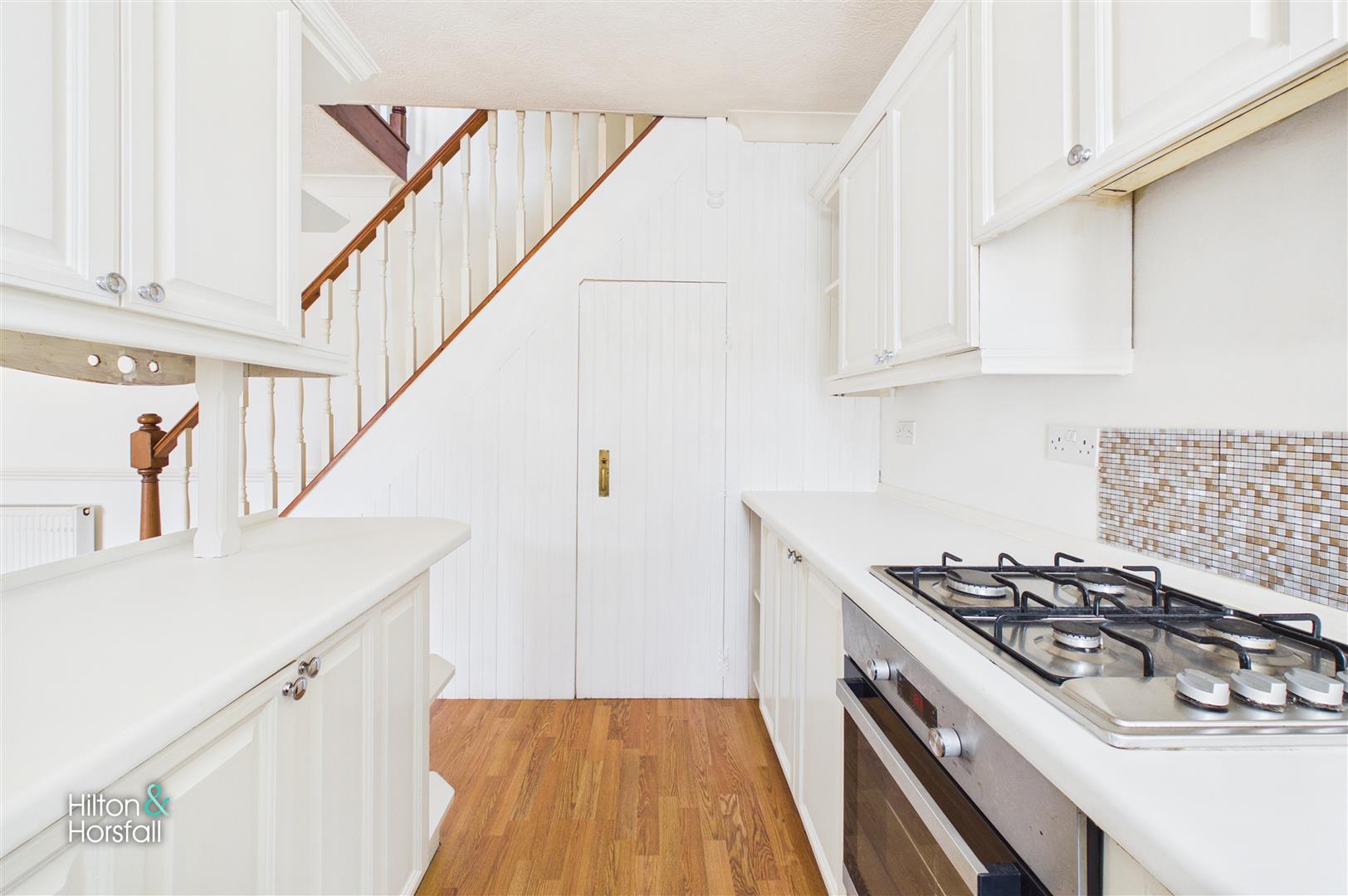 A fitted kitchen with a range of matching wall and base units, contrasting work surfaces and tiled splashbacks. Incorporating a stainless steel sink and drainer unit beneath a UPVC double glazed window, integrated oven with four ring gas hob and space for additional appliances. The kitchen is open plan to the living area and benefits from a useful under stairs storage cupboard, offering practical additional storage.