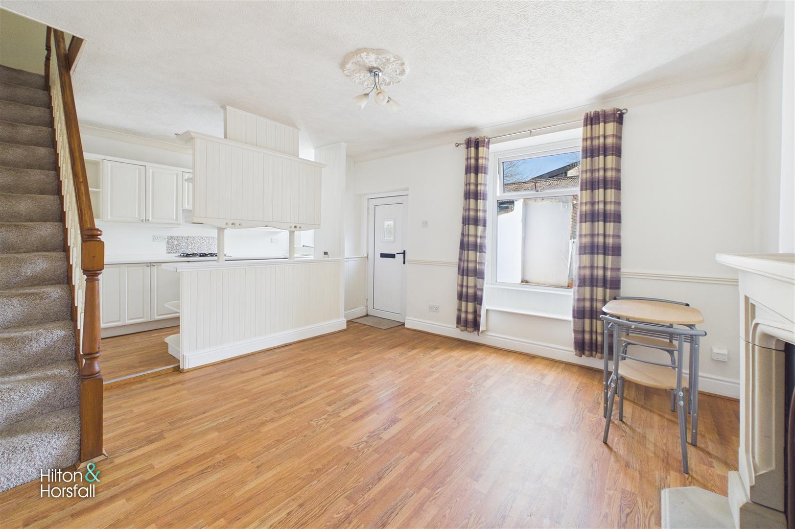 A spacious and well-presented living room having wood effect flooring, central ceiling light point, radiator and a large UPVC double glazed window allowing in an abundance of natural light. The room features a decorative fireplace with stone surround creating a cosy focal point and offers ample space for comfortable seating and dining furniture. Open plan access leads through to the kitchen area and there is also a staircase providing access to the first floor.
