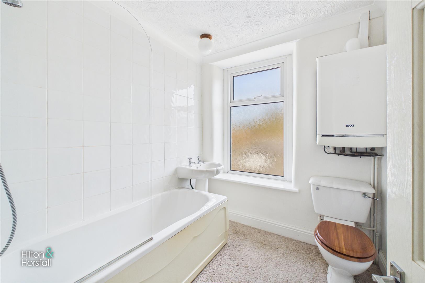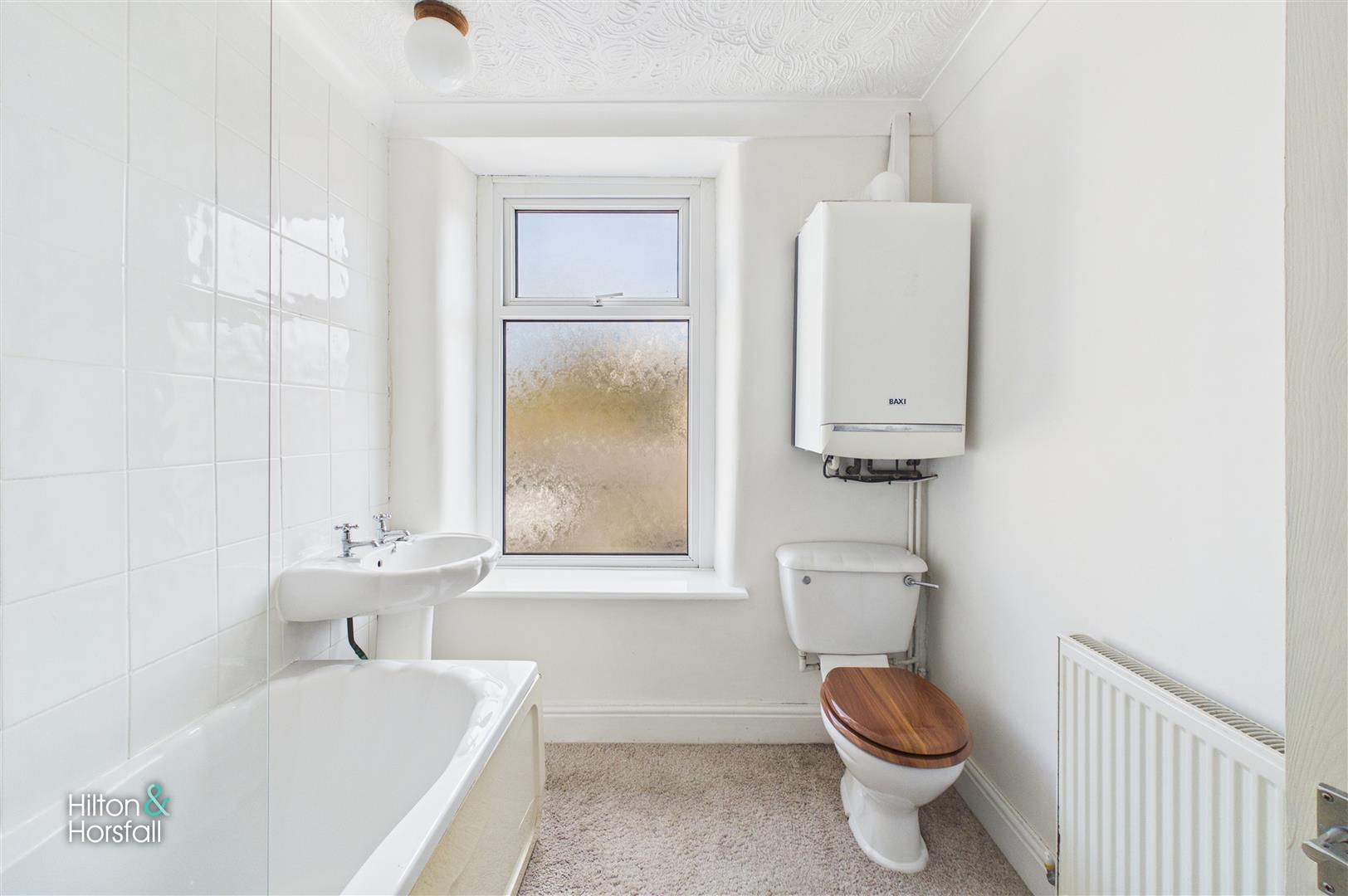 A three piece bathroom suite comprising of a panelled bath with shower over, pedestal wash basin and low level WC. The room benefits from tiled splashbacks, radiator, ceiling light point and a UPVC double glazed frosted window allowing for natural light while maintaining privacy.