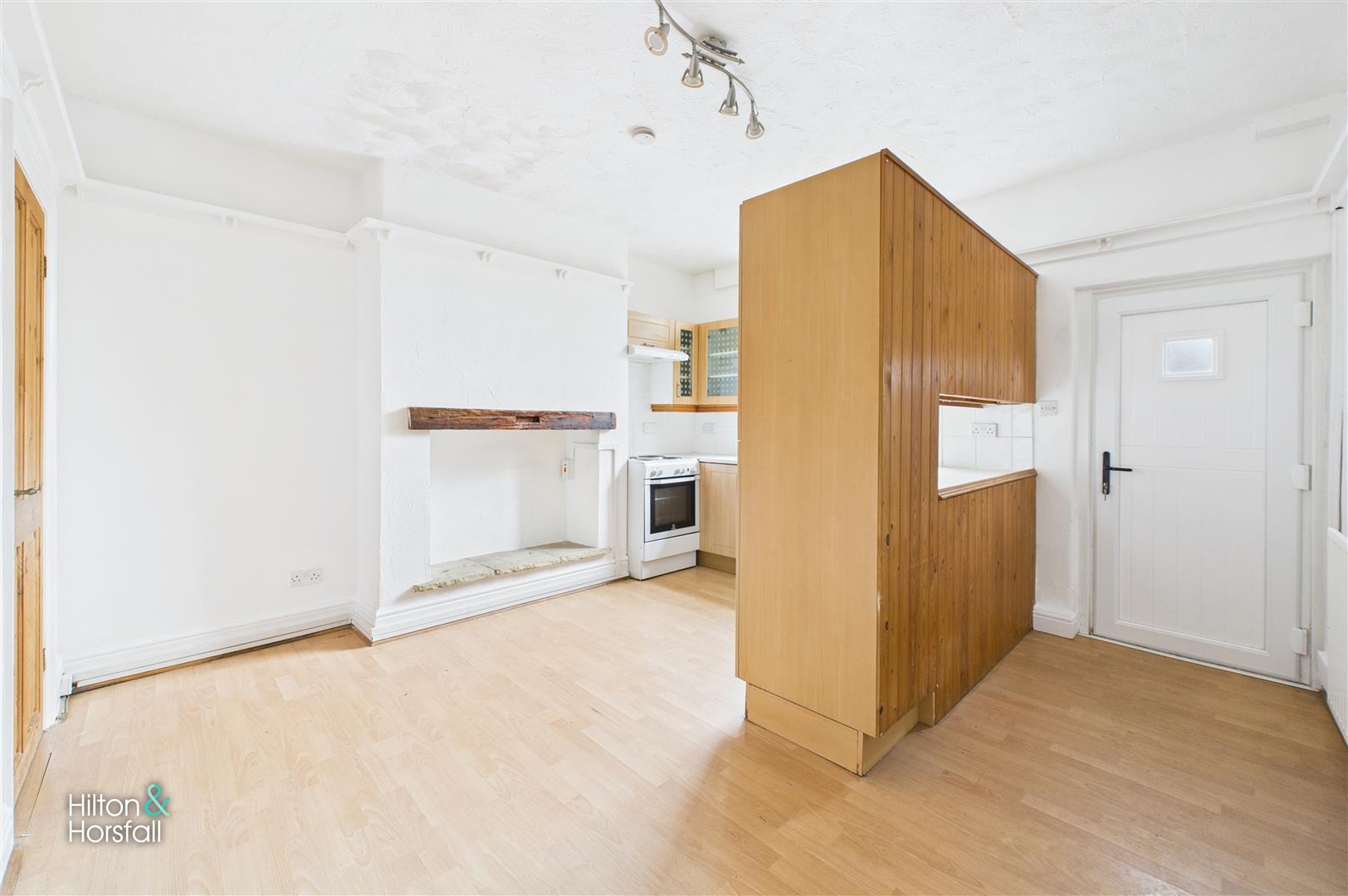 A generous dining kitchen positioned to the rear of the property, offering ample space for both everyday dining and cooking. The kitchen is fitted with a range of base and wall units with complementary work surfaces, incorporating an electric oven and hob with extractor above, stainless steel sink unit and space for additional appliances. A feature chimney breast with rustic timber lintel adds character to the room, while the open layout provides excellent versatility for a dining table or breakfast area. Natural light is provided via a rear window, with direct access leading out to the enclosed rear yard.
