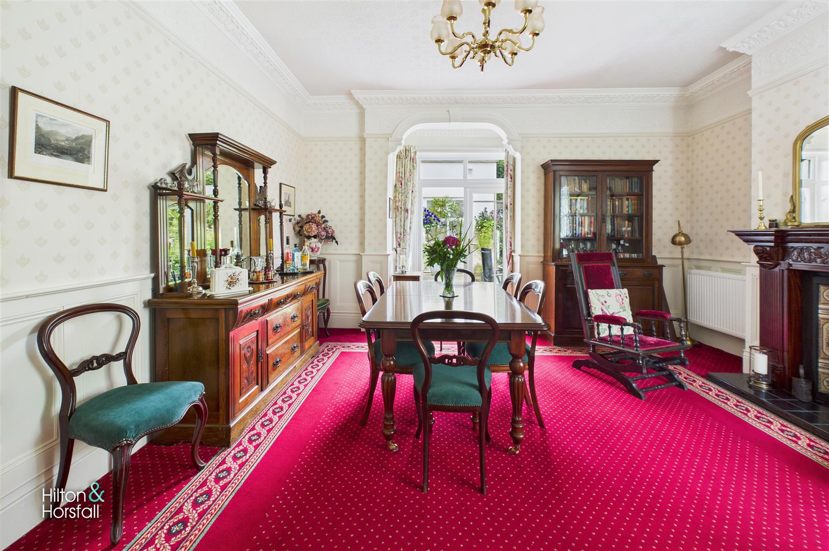 A generous formal dining room with dual aspect windows and French doors opening to the rear courtyard garden. Features include an ornate reproduction period fireplace, decorative coving, and ample space for entertaining.