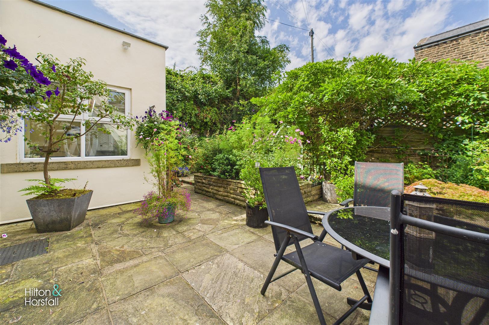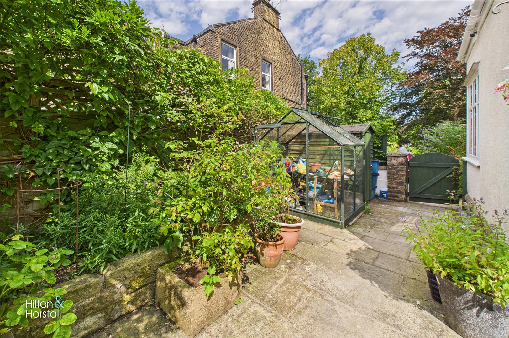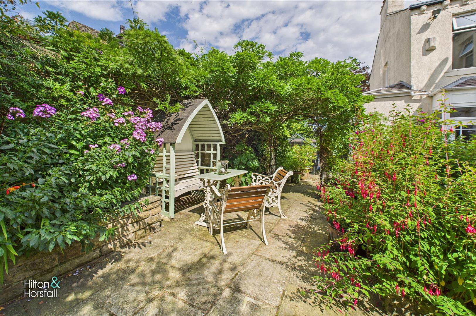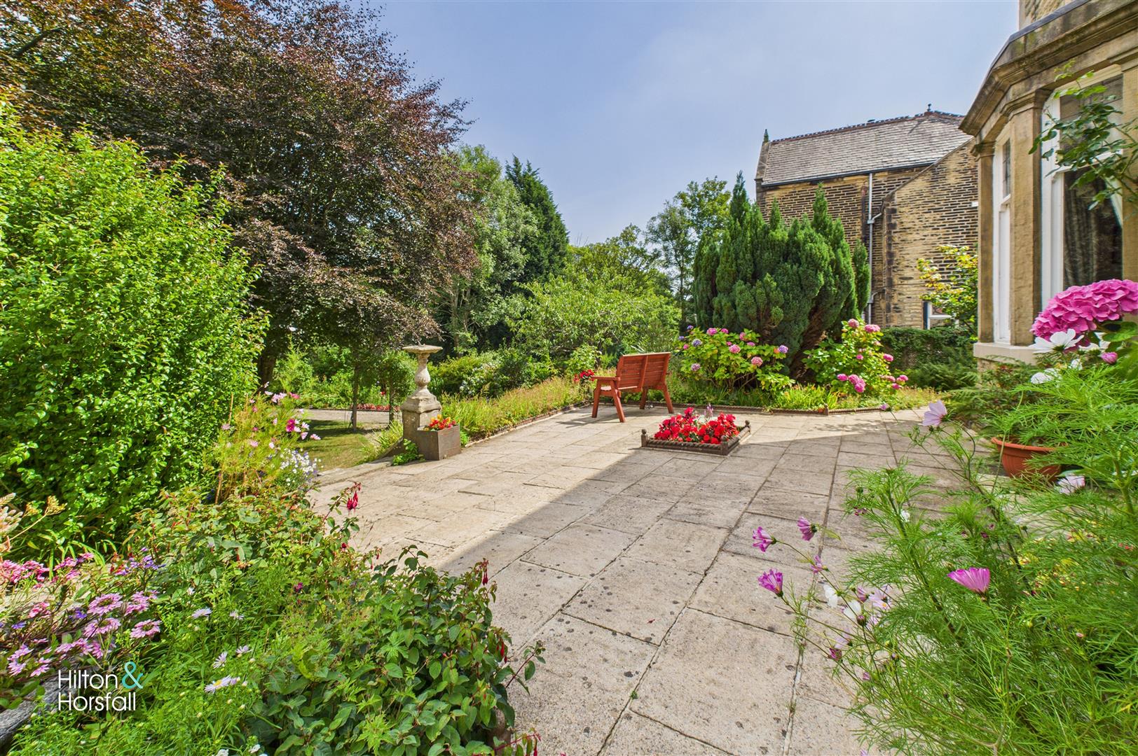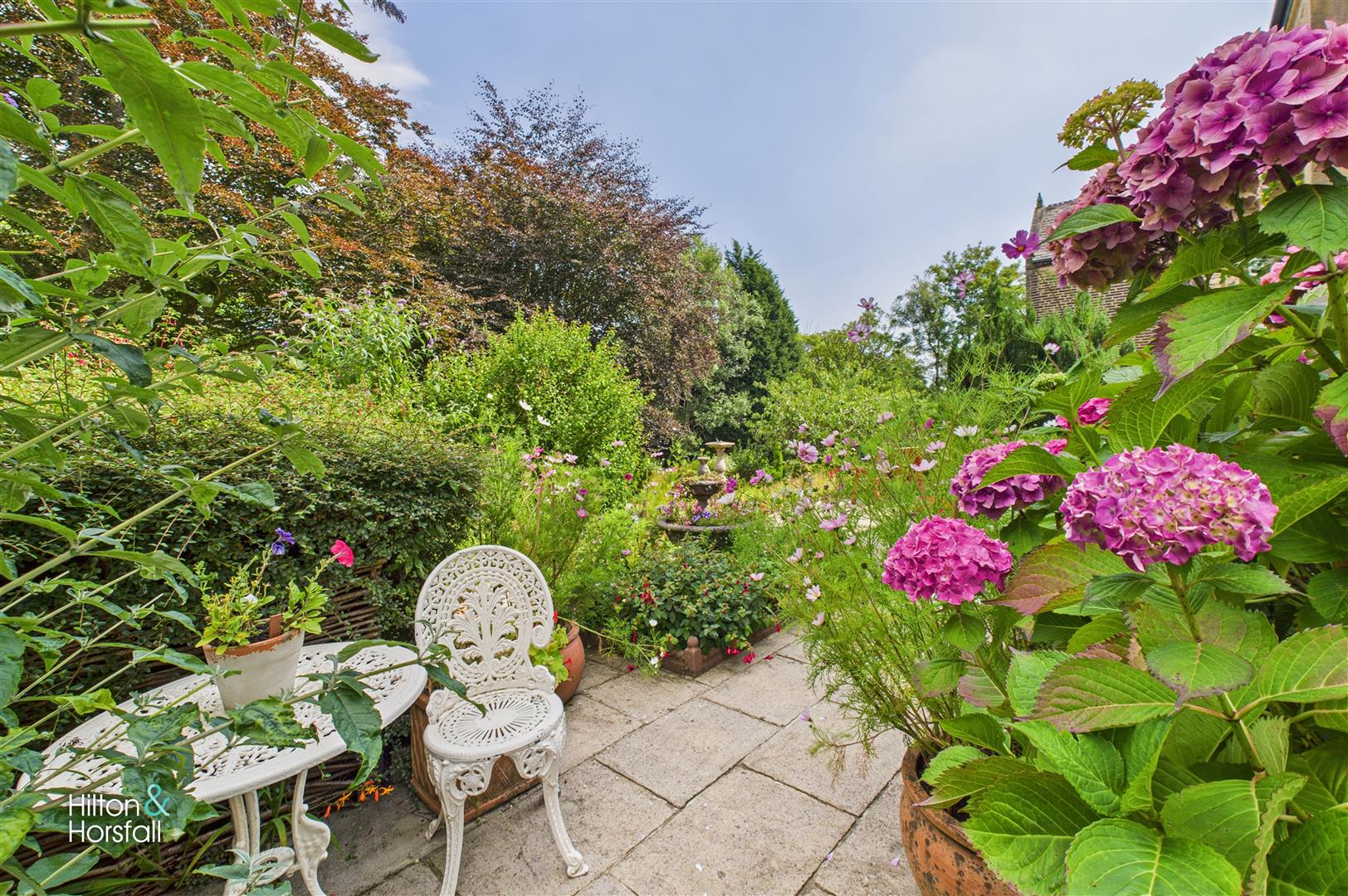 The property is approached via a 130ft driveway, providing ample parking. To the front is an elevated stone terrace with steps leading through landscaped mature gardens filled with established trees, shrubs, and seasonal planting. The rear and side offer a secluded courtyard garden with seating areas, water feature, greenhouse, shed, and space for outdoor entertaining.