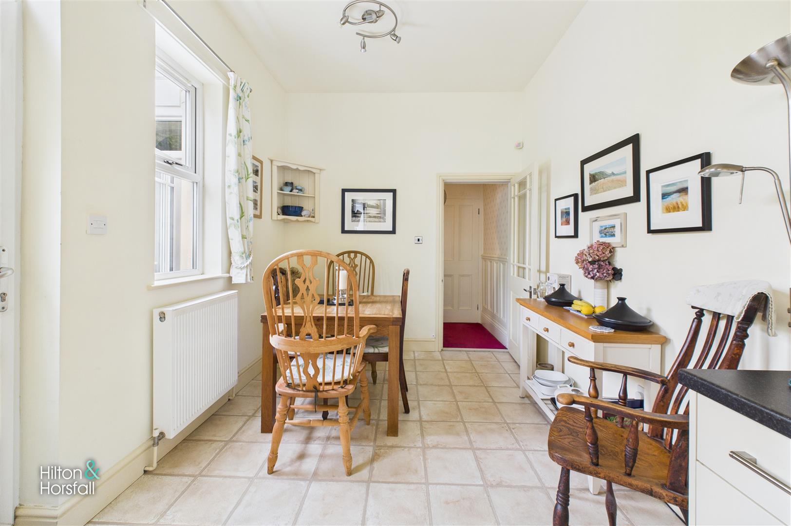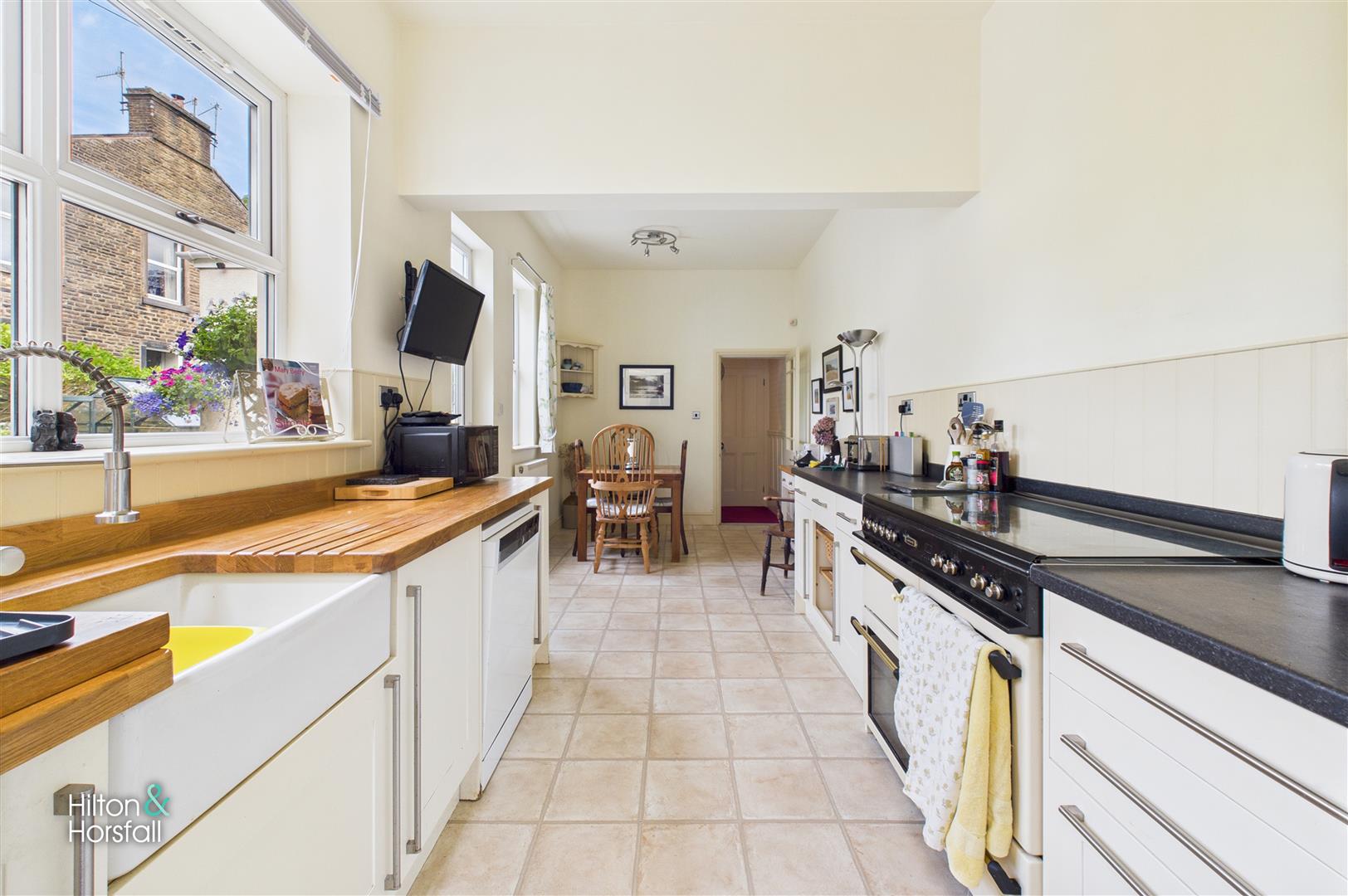 A well-appointed kitchen with a range of base units only, contrasting worktops, and a Belfast sink. There is space for a range-style cooker and freestanding appliances. The room flows into a bright dining area with windows to the side elevation and ample space for a family dining table.