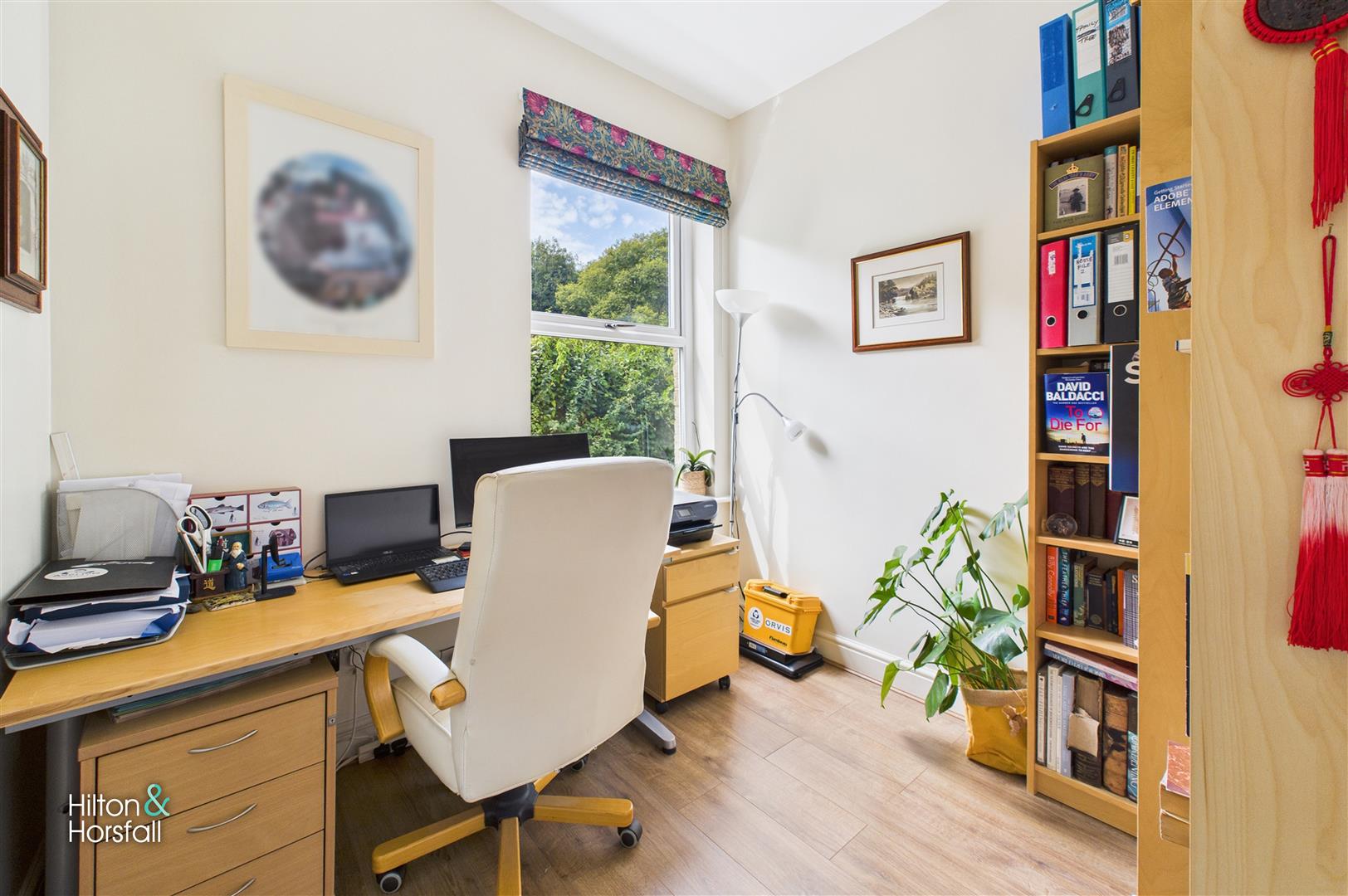 A versatile single bedroom, currently used as a home office, with rear-facing window.