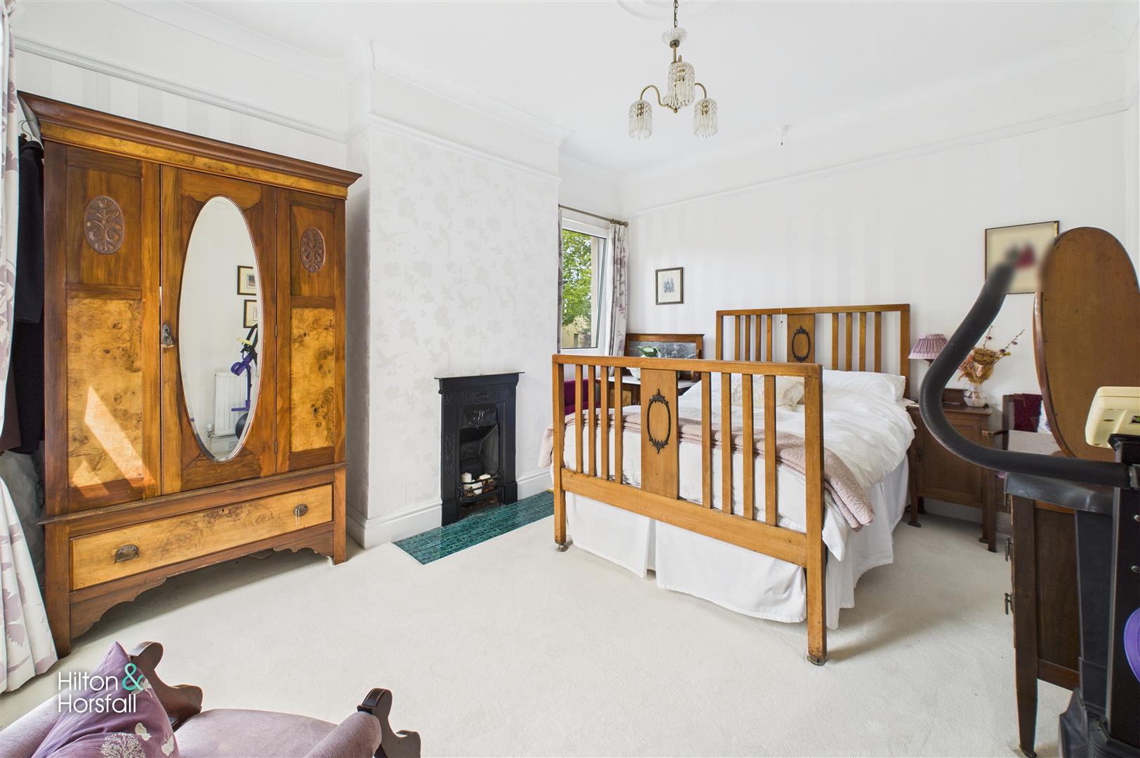 A spacious double bedroom with dual aspect windows to the side and rear elevations, and an original cast iron fireplace.