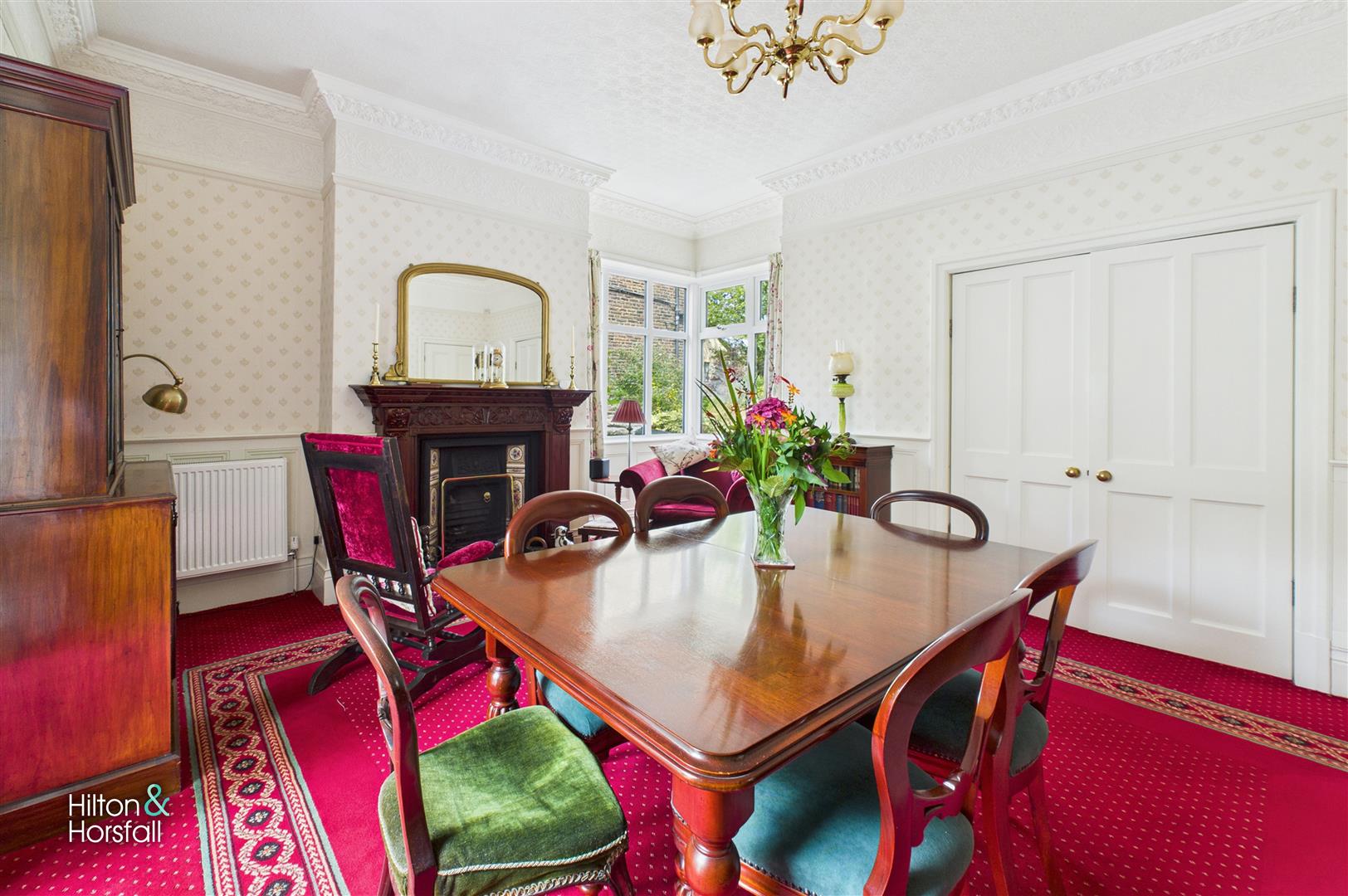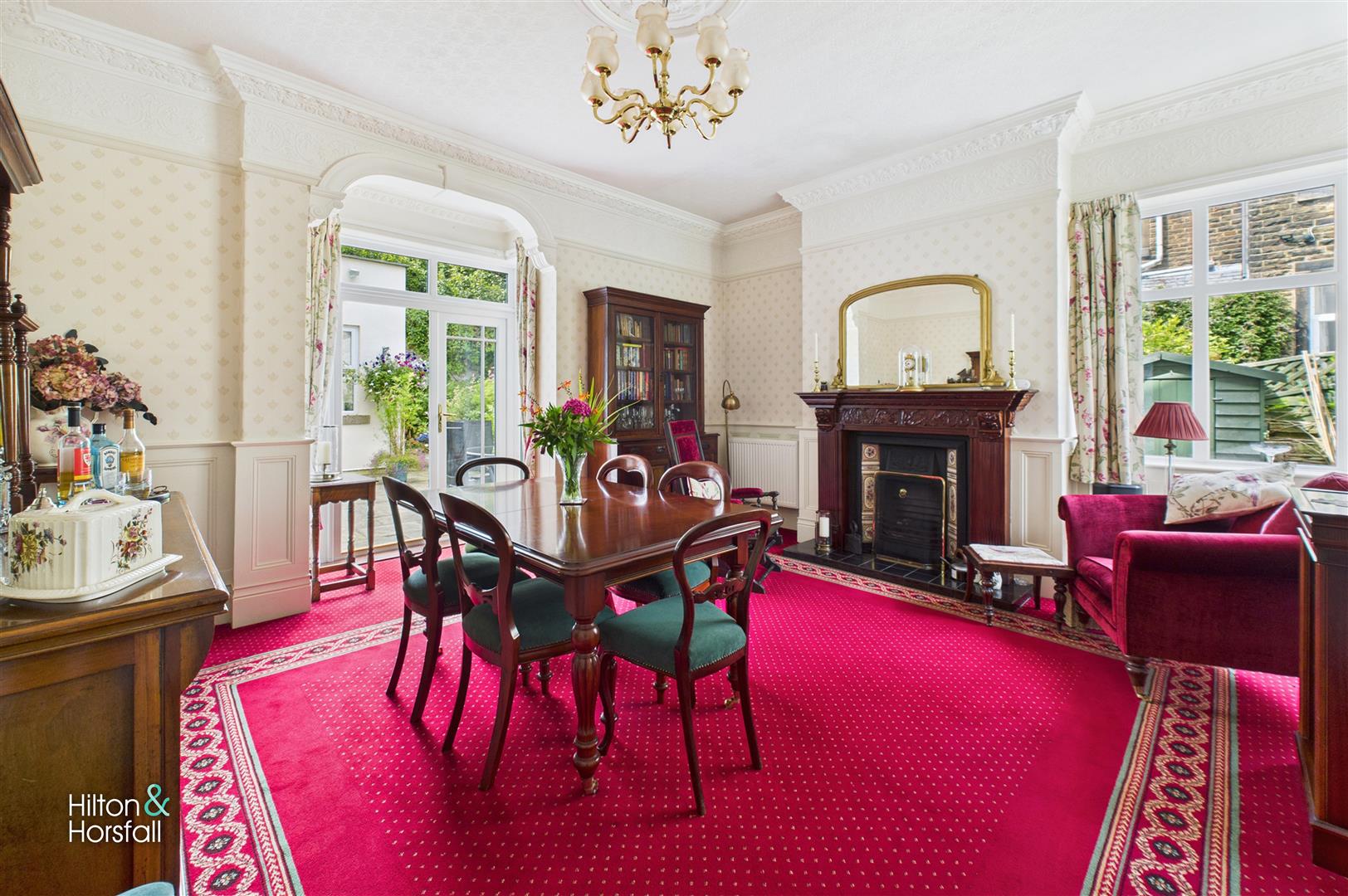 A bright and elegant reception room with a large bay window to the front elevation, flooding the space with natural light. The focal point is a beautiful fireplace with intricate surround, complemented by high ceilings, picture rails, and decorative plasterwork. All original stained glass for the ground floor is safely stored in the cellar and can be reinstalled by the buyer if desired.