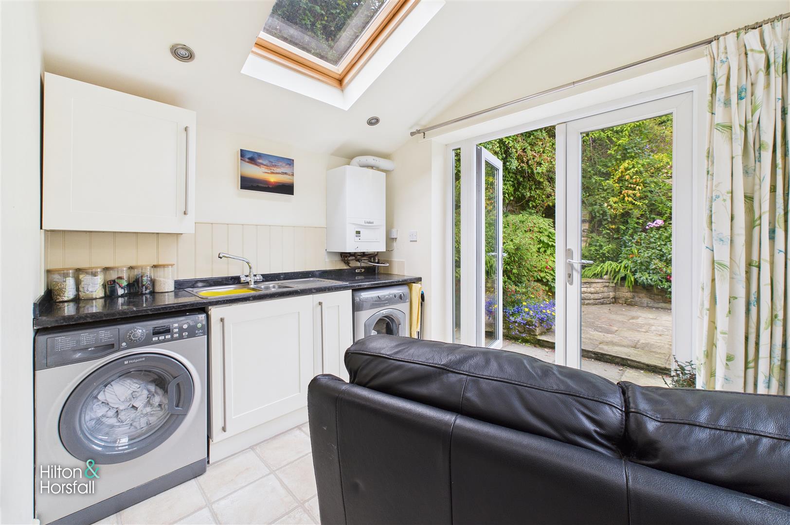 A practical addition with fitted base units, sink, plumbing for laundry appliances, Velux roof light, and French doors to the garden.