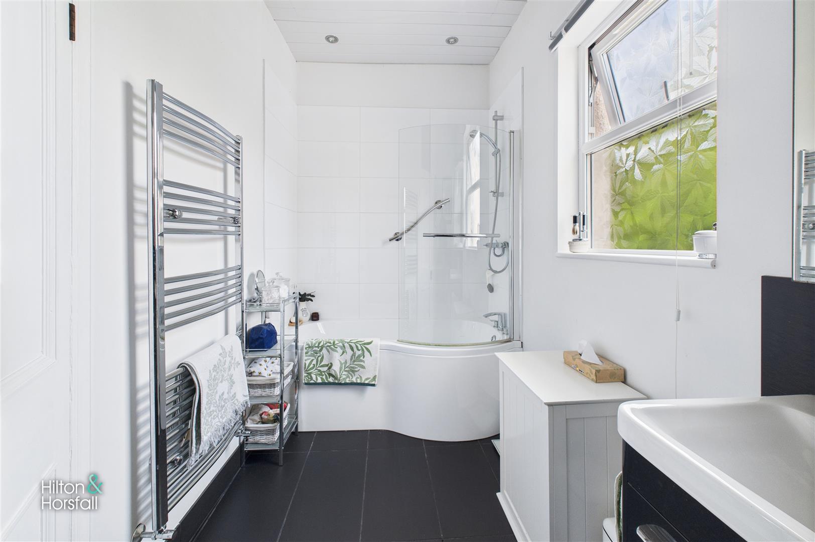 Fitted with a modern white suite comprising a bath with shower over, WC, wash basin, and chrome heated towel rail.