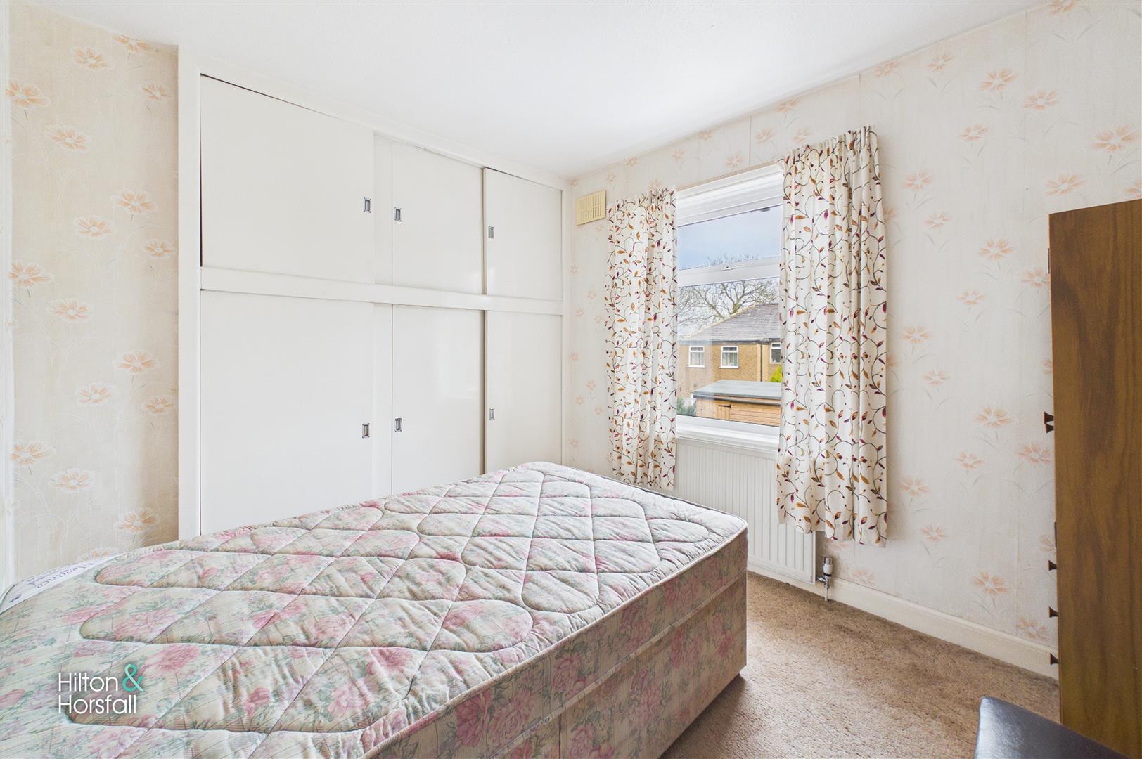 A well-proportioned bedroom positioned to the rear of the property, featuring a window overlooking the garden and fitted storage cupboards. The room provides space for bedroom furniture and offers a pleasant outlook.