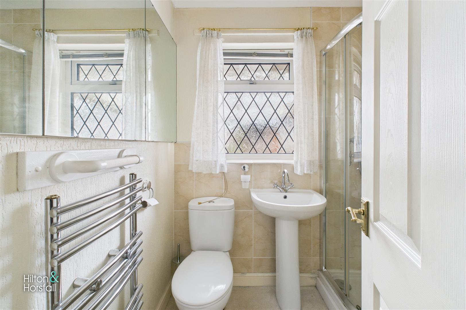 A convenient ground-floor shower room fitted with a corner shower enclosure, pedestal wash basin and low-level WC. Two frosted leaded windows offer natural light while maintaining privacy. The room also features wall-mounted mirrors and a heated towel rail. Ideal for everyday use or guest accommodation, this shower room could be modernised to create a sleek and contemporary space.