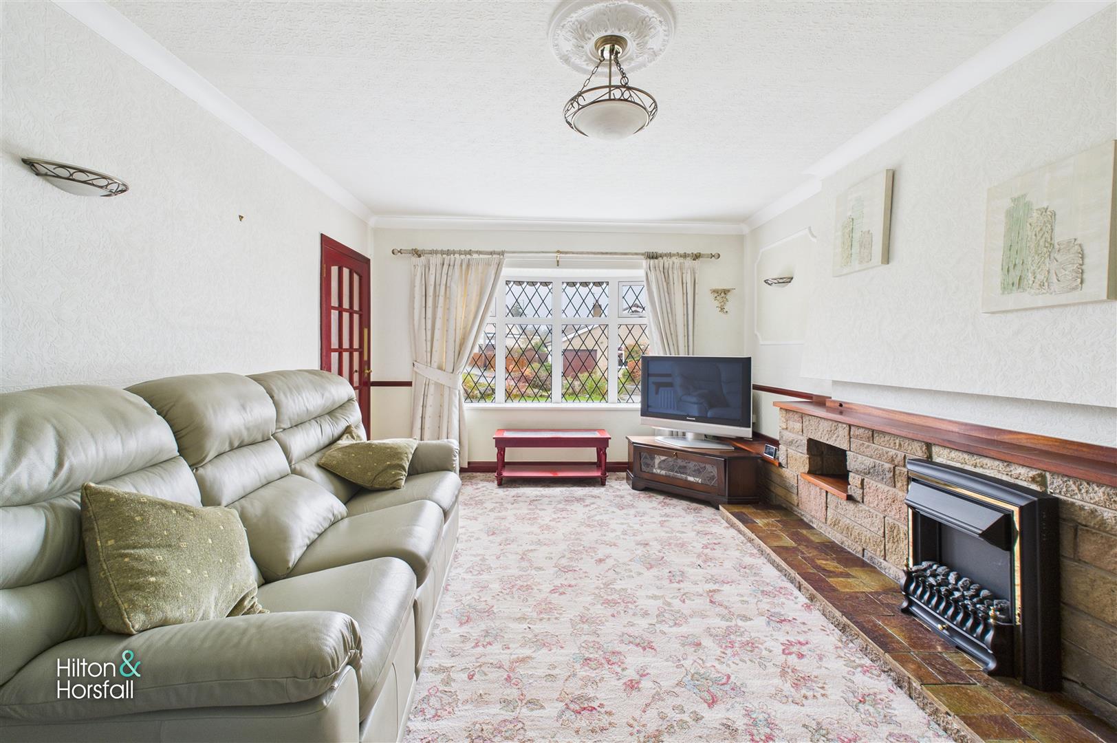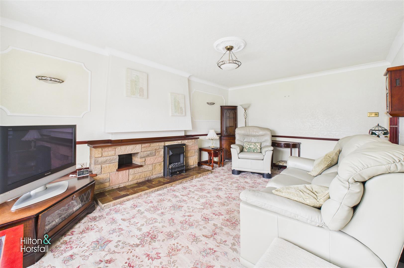 A bright and generously sized reception room positioned to the front of the property, featuring a large bay-style window with leaded glazing that allows plenty of natural light to fill the space. The room includes an attractive stone fireplace surround with a gas fire, wall-mounted lighting, and traditional coving. Offering excellent proportions and a pleasant outlook, this living room provides a comfortable space to relax and entertain. It would benefit from modernisation, presenting a great opportunity for buyers to redesign and style the room to suit contemporary tastes.