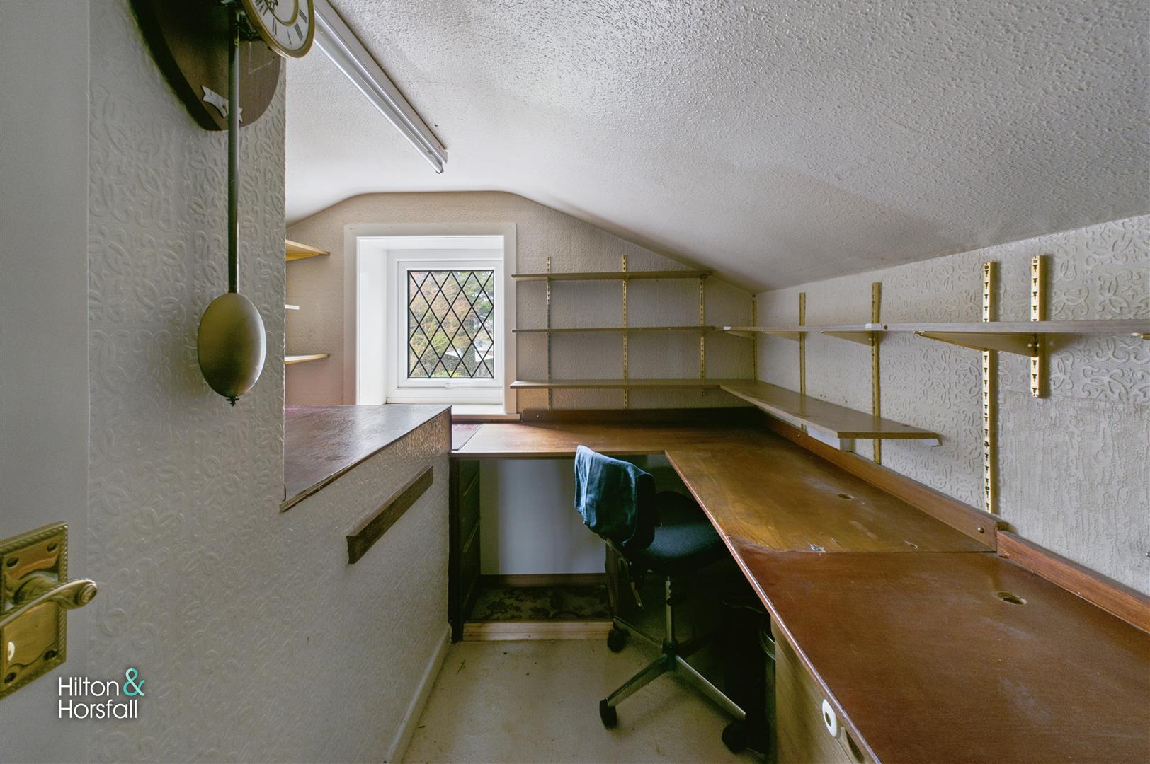 A compact yet practical study located on the first floor, ideal for use as a home office, hobby room or additional storage space. The room features a window with leaded glazing, built-in shelving and fitted work surfaces, making it well-suited for those working from home or seeking a dedicated workspace. With its characterful sloped ceiling and adaptable layout, this room offers great potential for modernisation to create a functional and cosy retreat.
