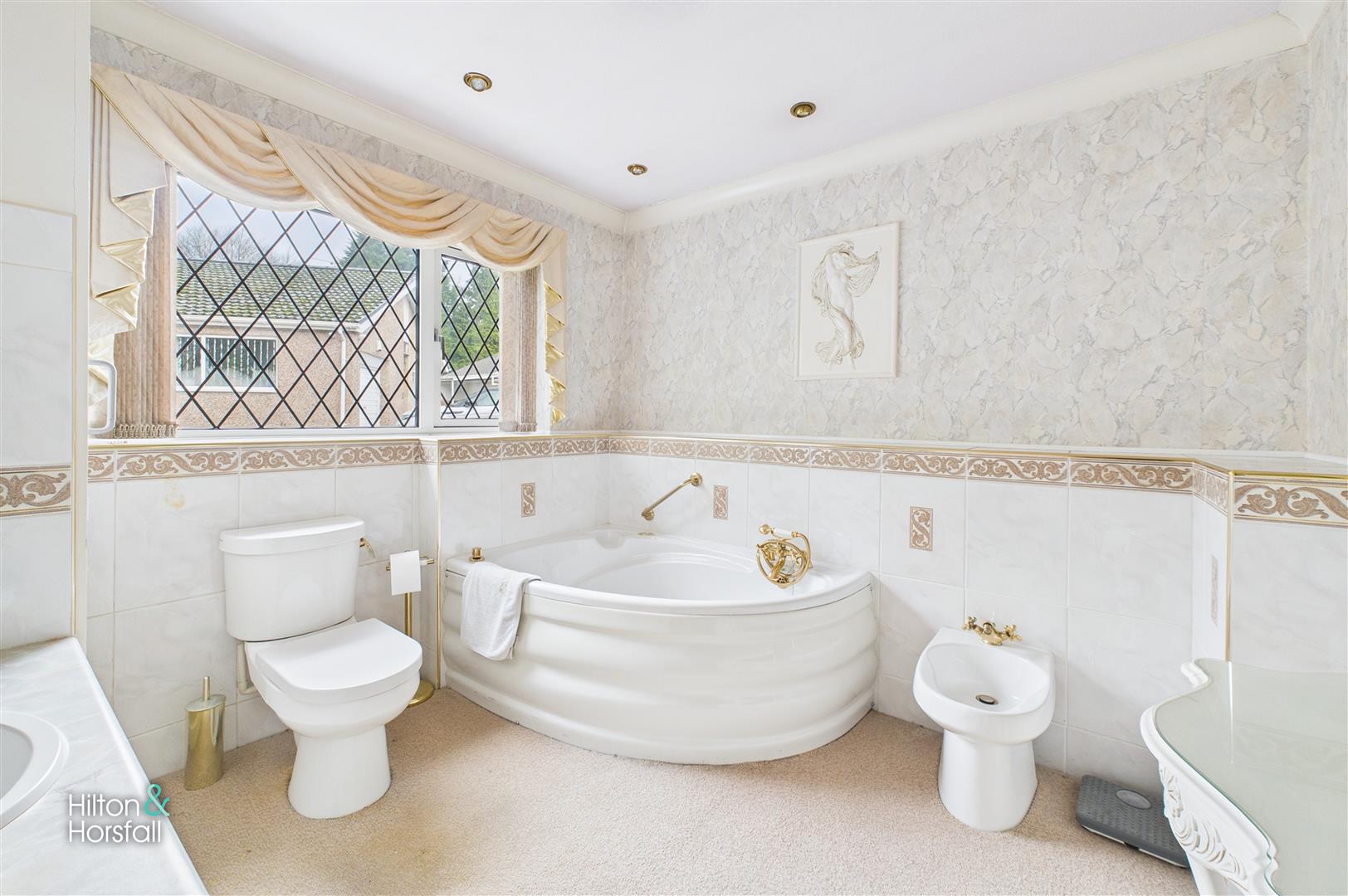 A spacious ground-floor bathroom fitted with a corner bath, low-level WC, bidet and wash basin. A large leaded window provides natural light, and the room is finished with tiled walls and decorative detailing. The bathroom is generous in size and offers excellent potential for a complete modern redesign—ideal for creating a contemporary family bathroom or a luxurious ground-floor shower room to complement the main bedroom.