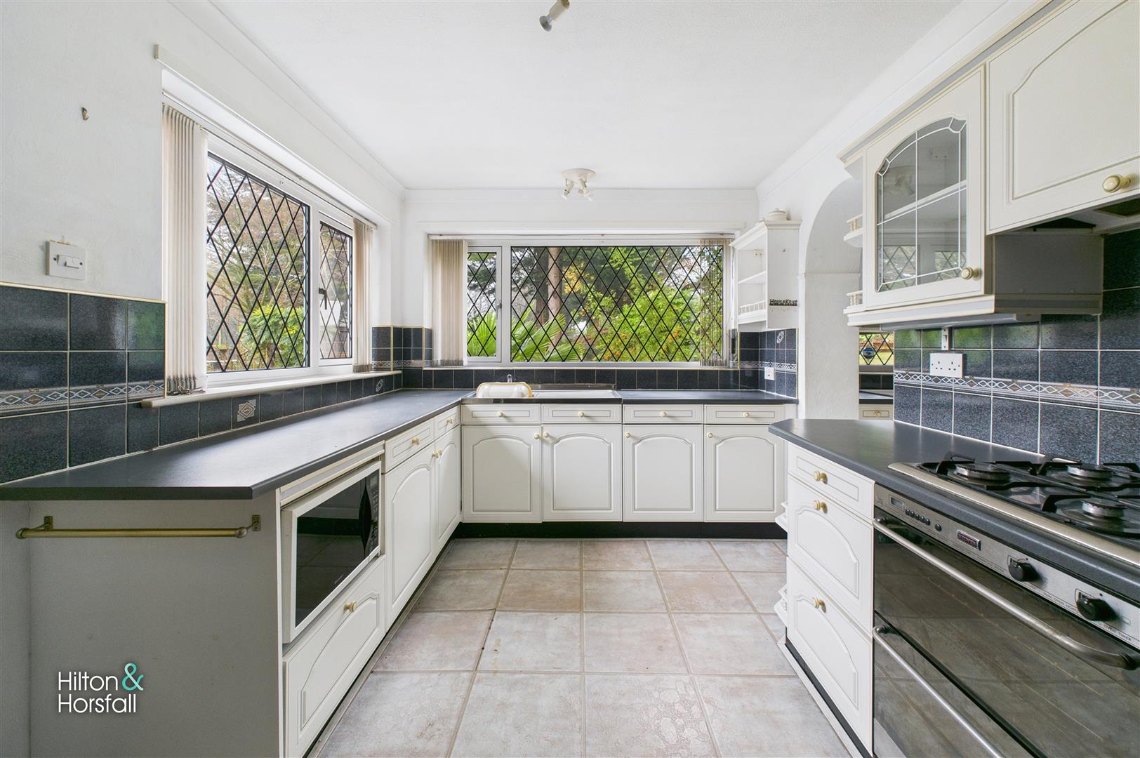A spacious dining kitchen located to the rear of the property, fitted with a range of wall and base units, ample work surfaces, and integrated appliances. Dual-aspect leaded windows provide an attractive outlook over the garden and allow plenty of natural light into the space. The kitchen opens into a dedicated dining area, creating a sociable and functional layout ideal for everyday living. From here, there is direct access into the adjoining utility room. The whole space offers excellent potential for modernisation and redesign—whether retaining the current layout or transforming it into a contemporary open-plan kitchen-diner.