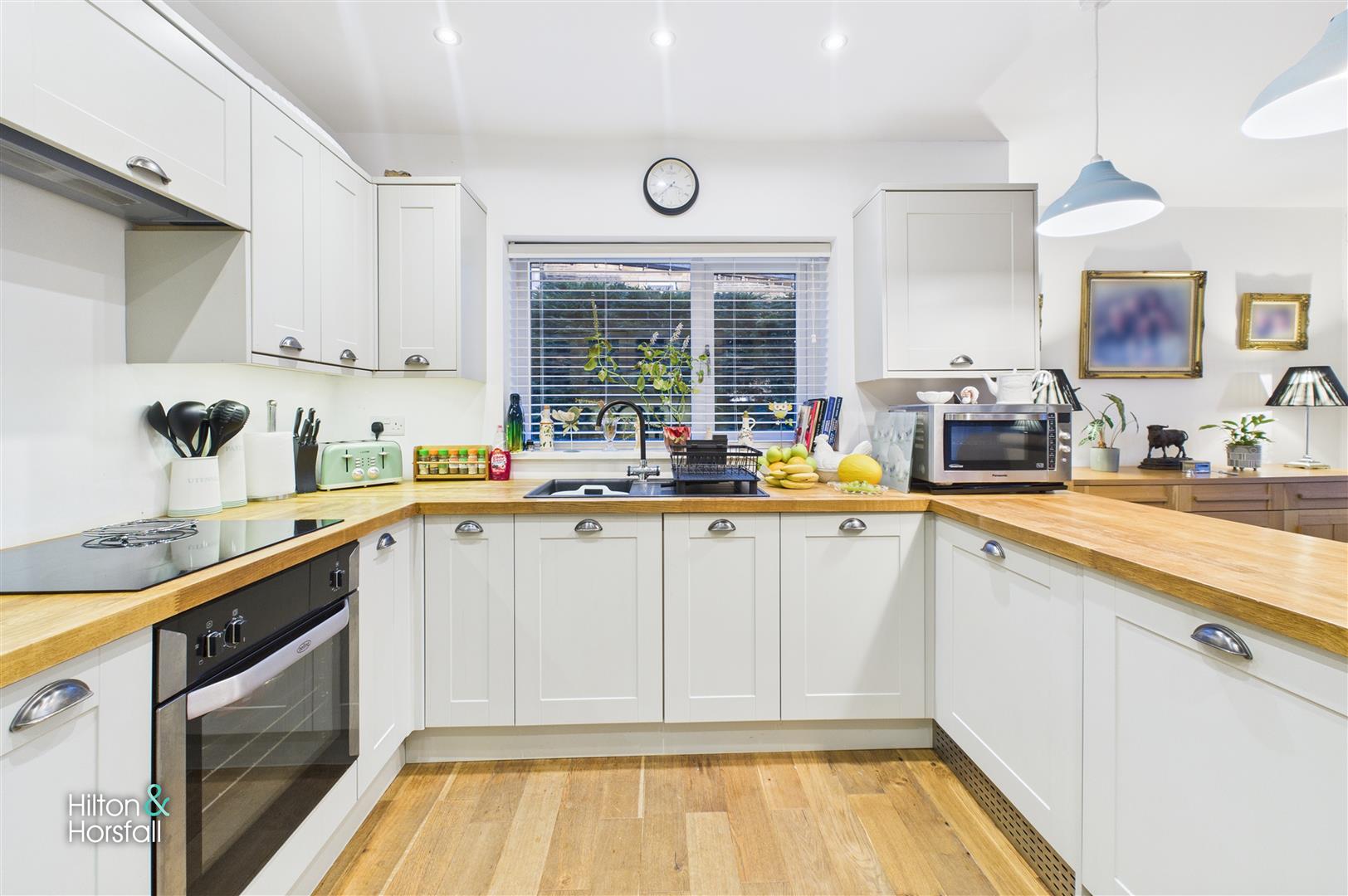 A stunning, contemporary kitchen fitted with a range of shaker-style wall, drawer, and base units complemented by solid wood work surfaces and under-cabinet lighting. The space is enhanced by integrated appliances, a built-in oven with hob and extractor, and a stainless-steel sink positioned beneath a large window that overlooks the side aspect. The open layout connects seamlessly with the dining area, creating a practical and sociable setting ideal for family living. Stylish pendant lighting and wood flooring complete this inviting and well-designed kitchen space.