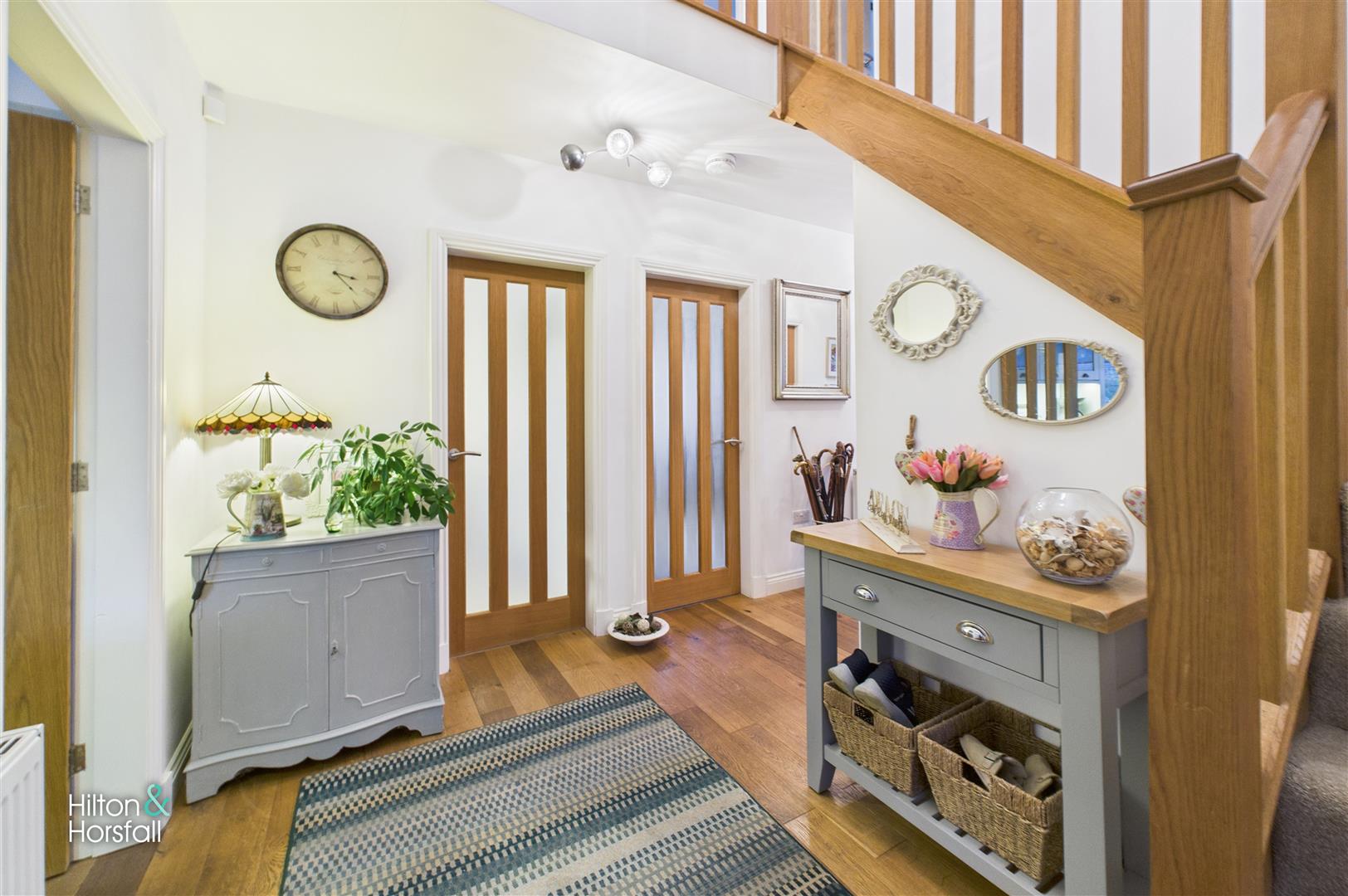 A welcoming entrance hallway featuring solid wood flooring, neutral décor, and a beautifully crafted staircase leading to the first floor. The space offers access to the main reception rooms and benefits from under-stairs storage, modern internal doors, and attractive finishing touches that create an immediate sense of warmth and style upon entering the home.
