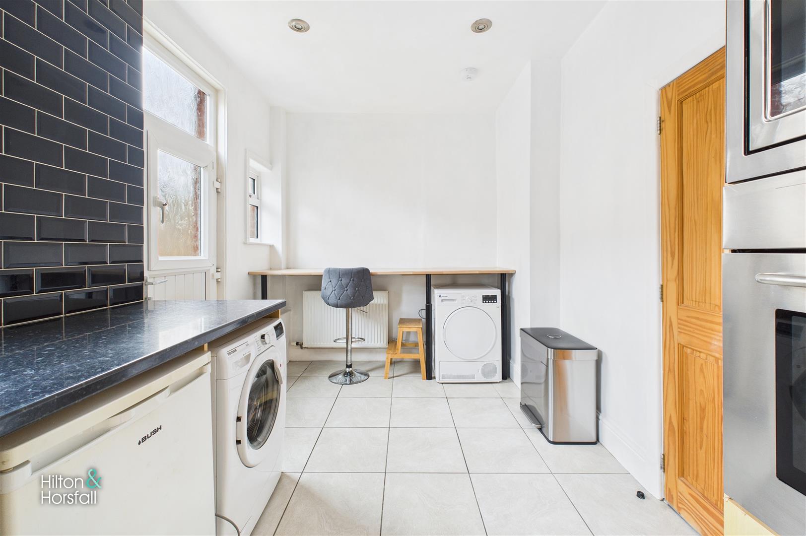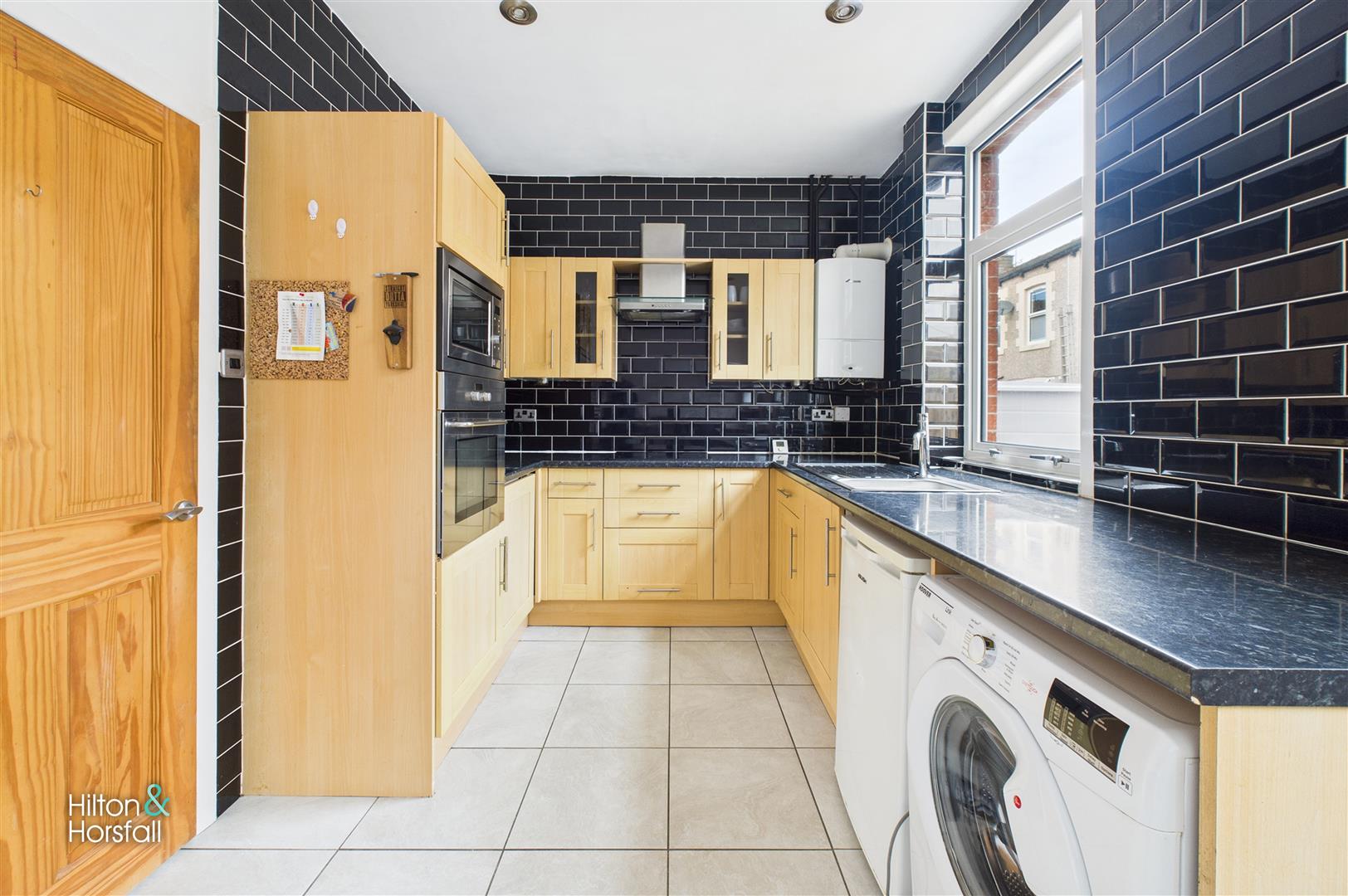 A stylish and spacious breakfast kitchen fitted with a modern range of light wood wall and base units complemented by sleek black tiled splashbacks and contrasting work surfaces. The room includes a built-in stainless steel oven and microwave, integrated extractor hood, and space for white goods. Finished with neutral décor and tiled flooring throughout, the kitchen also offers a convenient breakfast bar area with seating — ideal for casual dining or working from home. A uPVC double-glazed window and rear door provide plenty of natural light and direct access to the enclosed yard.