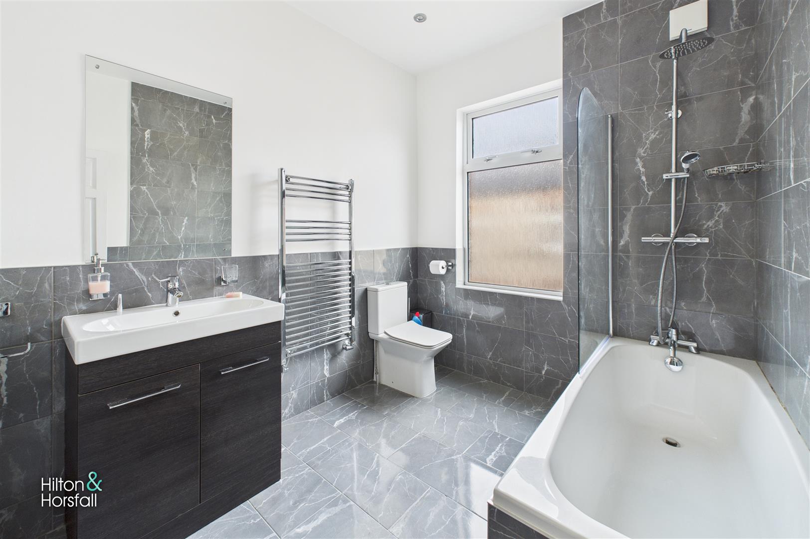 A contemporary three-piece bathroom suite finished to a high standard, featuring a panelled bath with rainfall shower over and glass screen, a modern vanity wash basin with storage beneath, and a low-level WC. The room is fully tiled in a stylish grey marble-effect design with matching floor tiles, complemented by chrome fittings including a heated towel rail. A frosted uPVC double-glazed window provides privacy while allowing plenty of natural light to flow through.
