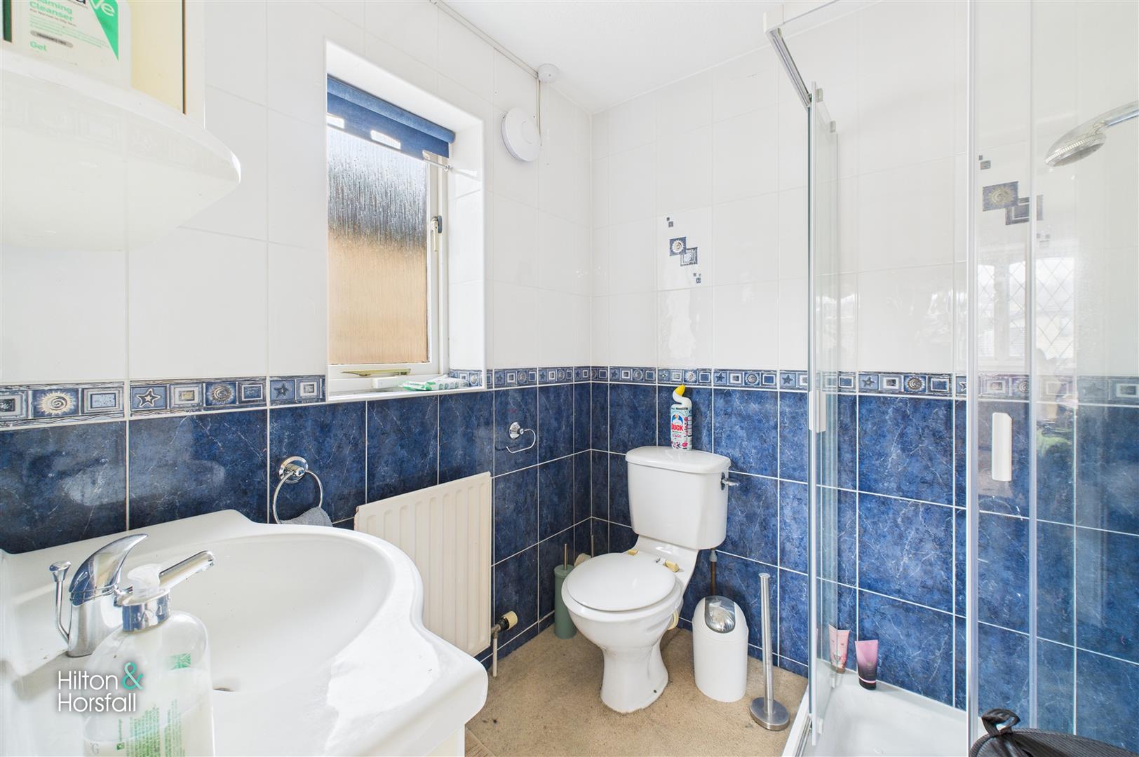 A well-appointed en-suite shower room fitted with a shower enclosure, wash basin and WC, finished with tiled walls and flooring and benefiting from a window providing natural light and ventilation.