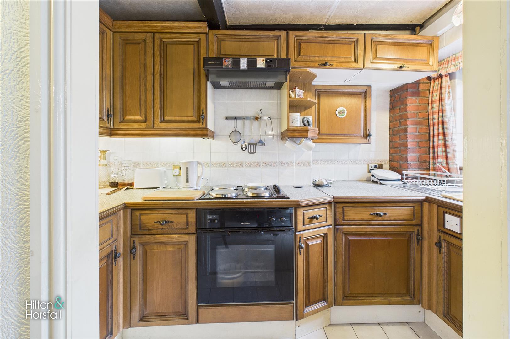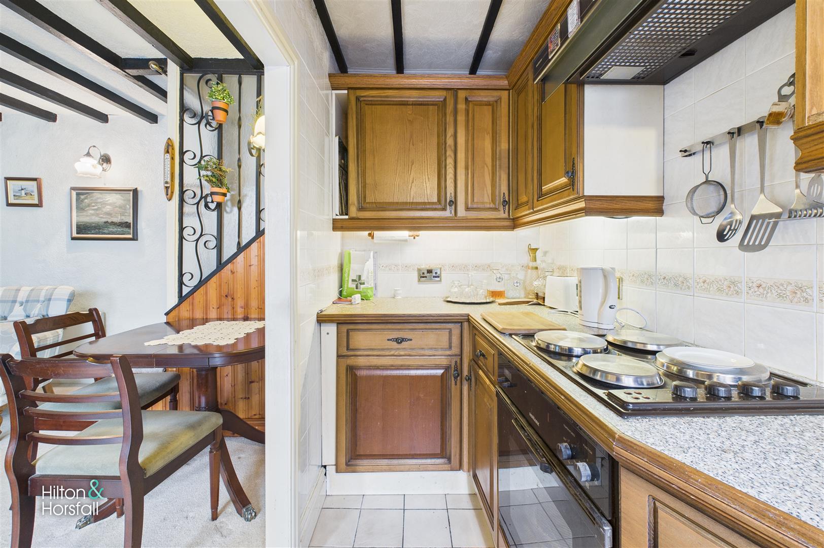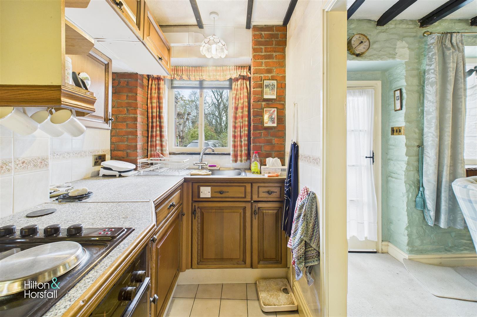 A compact yet well-designed kitchen fitted with a range of traditional wall and base units complemented by tiled splashbacks and ample work surface space. There is an integrated oven and hob with extractor over, stainless steel sink unit positioned beneath a large window, and exposed brick detailing adding warmth and character. The kitchen enjoys a bright aspect and provides access through to the adjoining sun room at the rear.
