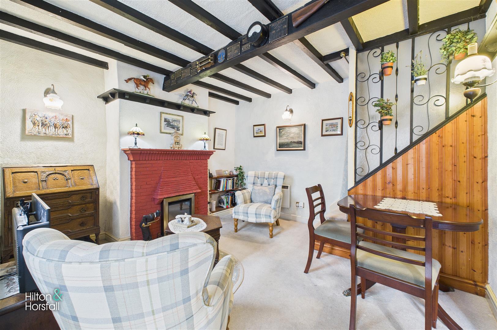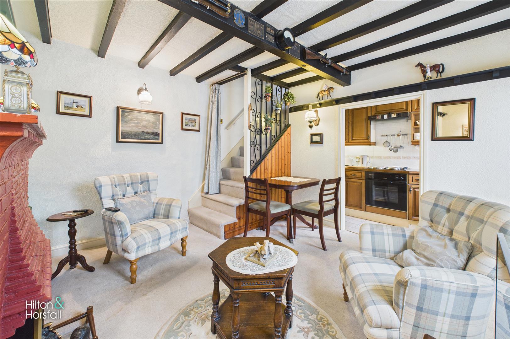 A beautifully presented and character-filled living space featuring exposed ceiling beams and a striking red brick feature fireplace that provides a charming focal point. The room is bright and welcoming, with space for both a sitting and dining area, and tasteful décor that complements the cottage’s traditional feel. An open staircase leads to the first floor, while a doorway gives access through to the kitchen.