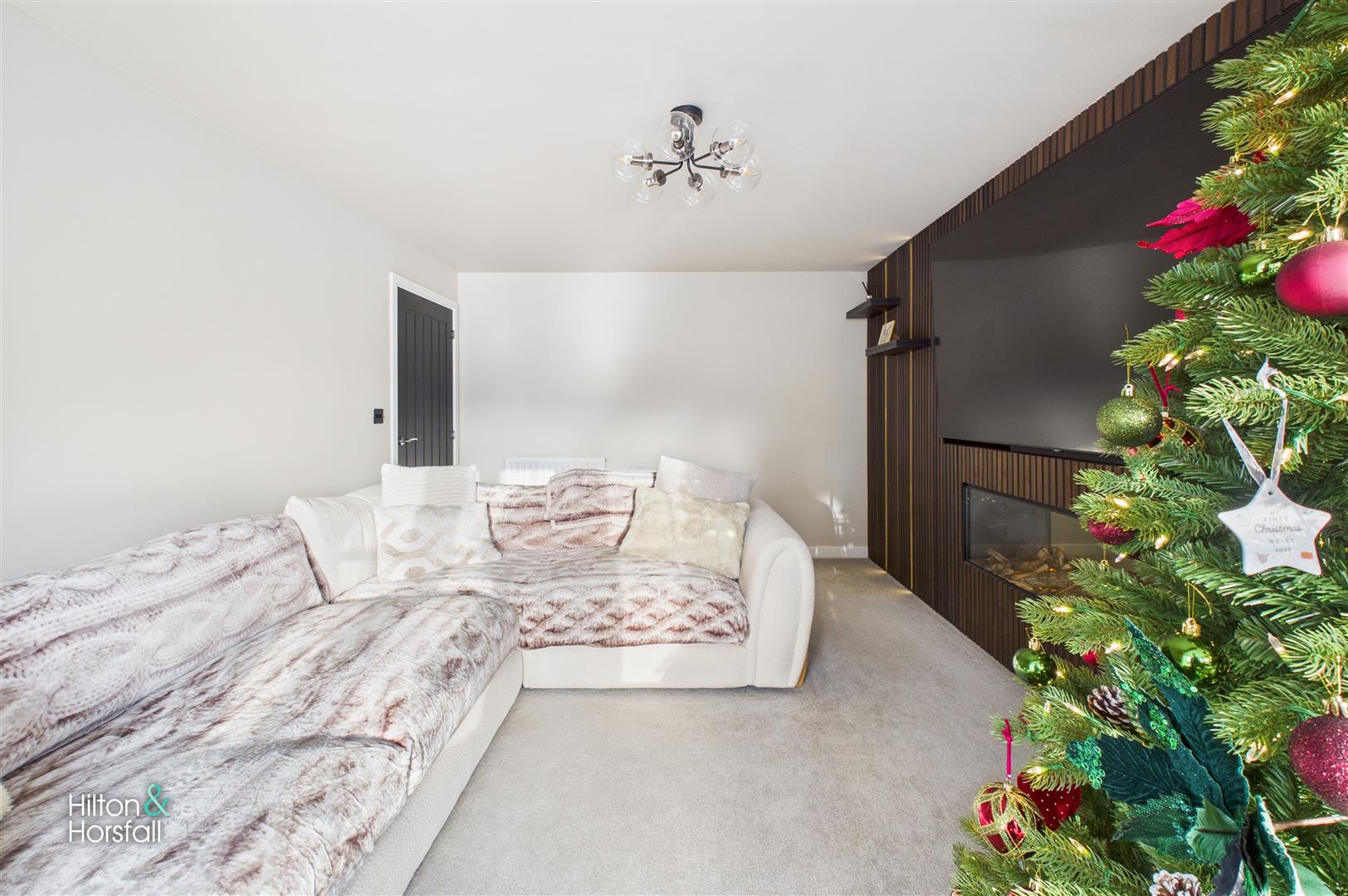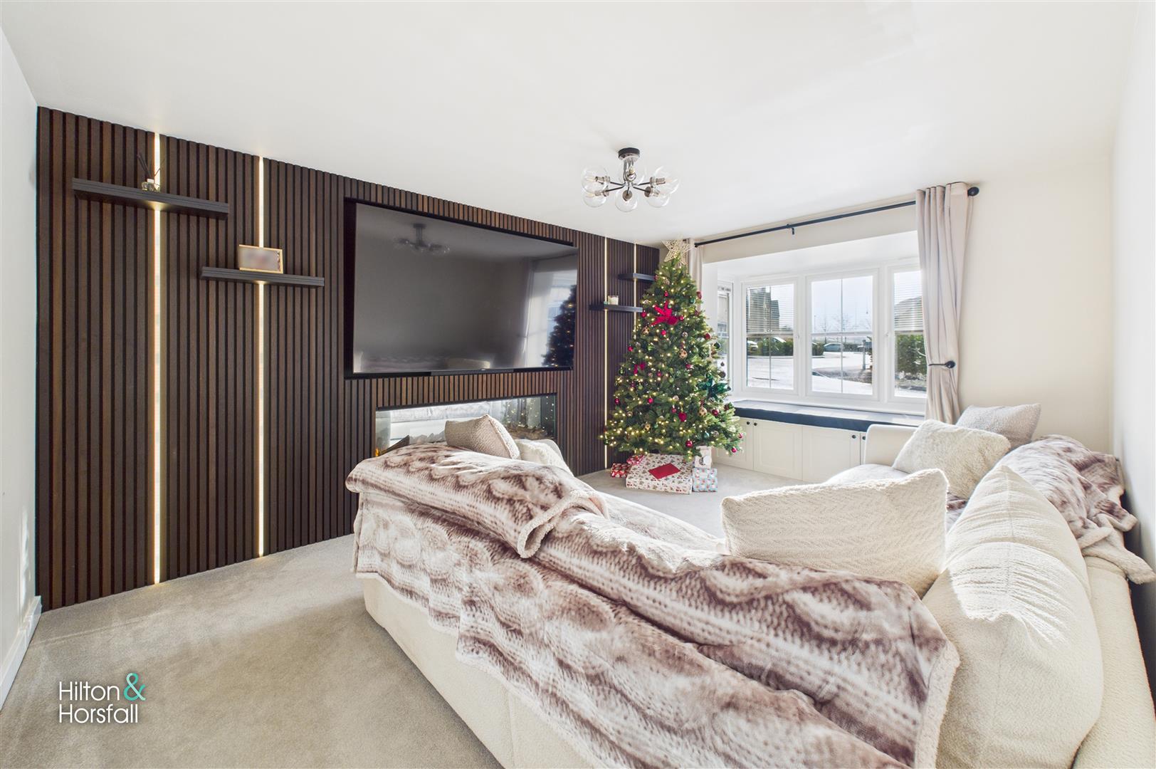 A beautifully presented and generously proportioned living room, finished in a contemporary style and designed to create a warm yet modern atmosphere. A striking feature media wall takes centre stage, incorporating a sleek inset electric fire, bespoke shelving and a large wall-mounted television recess, all enhanced by subtle vertical lighting which adds real depth and character to the space. The room is finished with soft neutral décor and plush carpeting, creating a calm and inviting feel, while a large front-facing window allows natural light to flood in throughout the day. This is a superb space for both relaxing evenings and entertaining, offering the perfect balance of comfort and modern design.