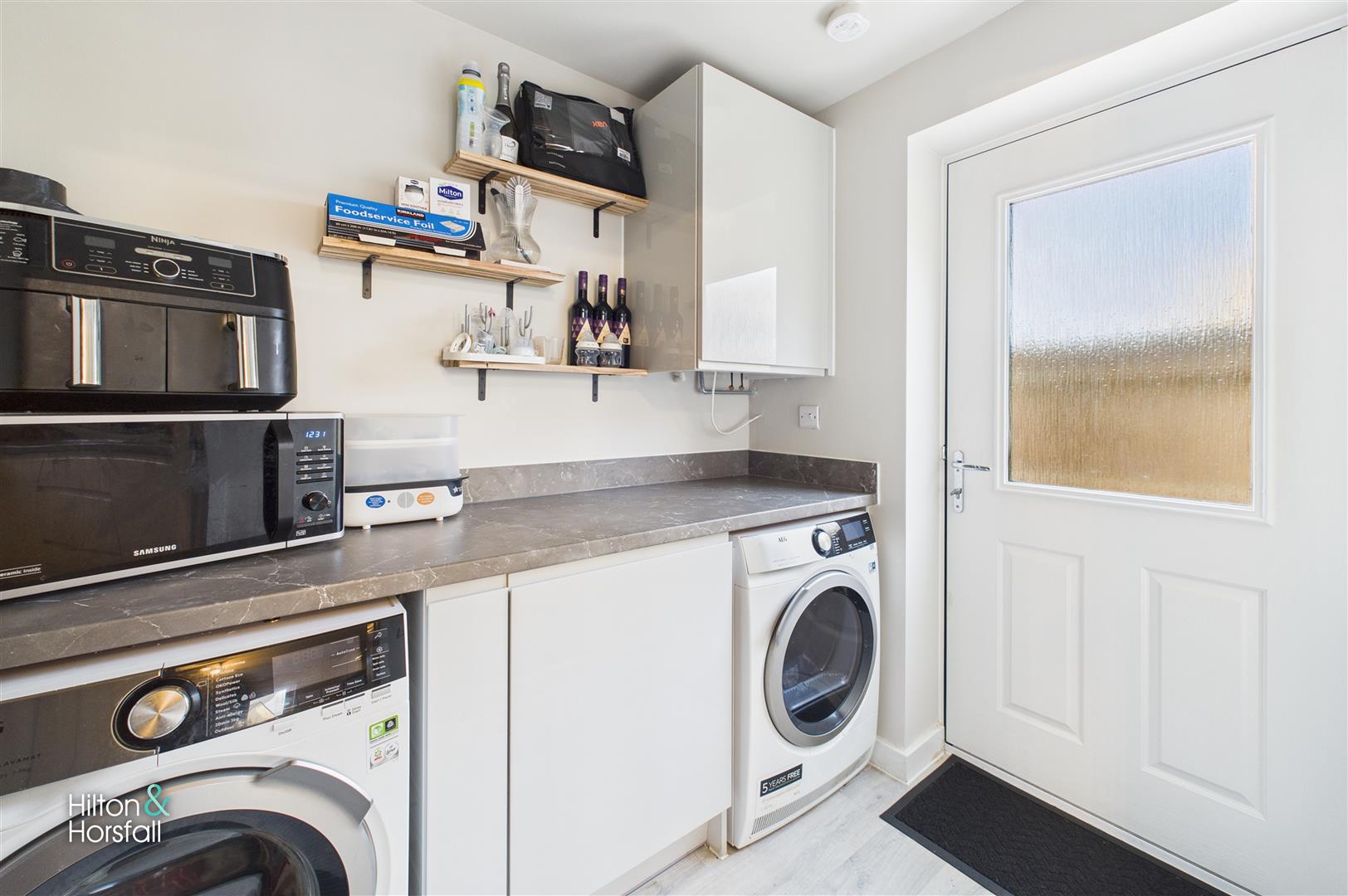 Accessed directly from the kitchen, this practical utility room provides additional workspace and storage, helping to keep the main living areas clutter-free. Fitted with complementary units and work surfaces, the room offers space and plumbing for laundry appliances, along with further wall-mounted storage. A door opens out to the side external elevation, providing convenient access to the garden and side of the property, ideal for everyday family use and muddy boots. Finished in a clean, modern style, this is a highly functional addition that enhances the home’s day-to-day practicality.
