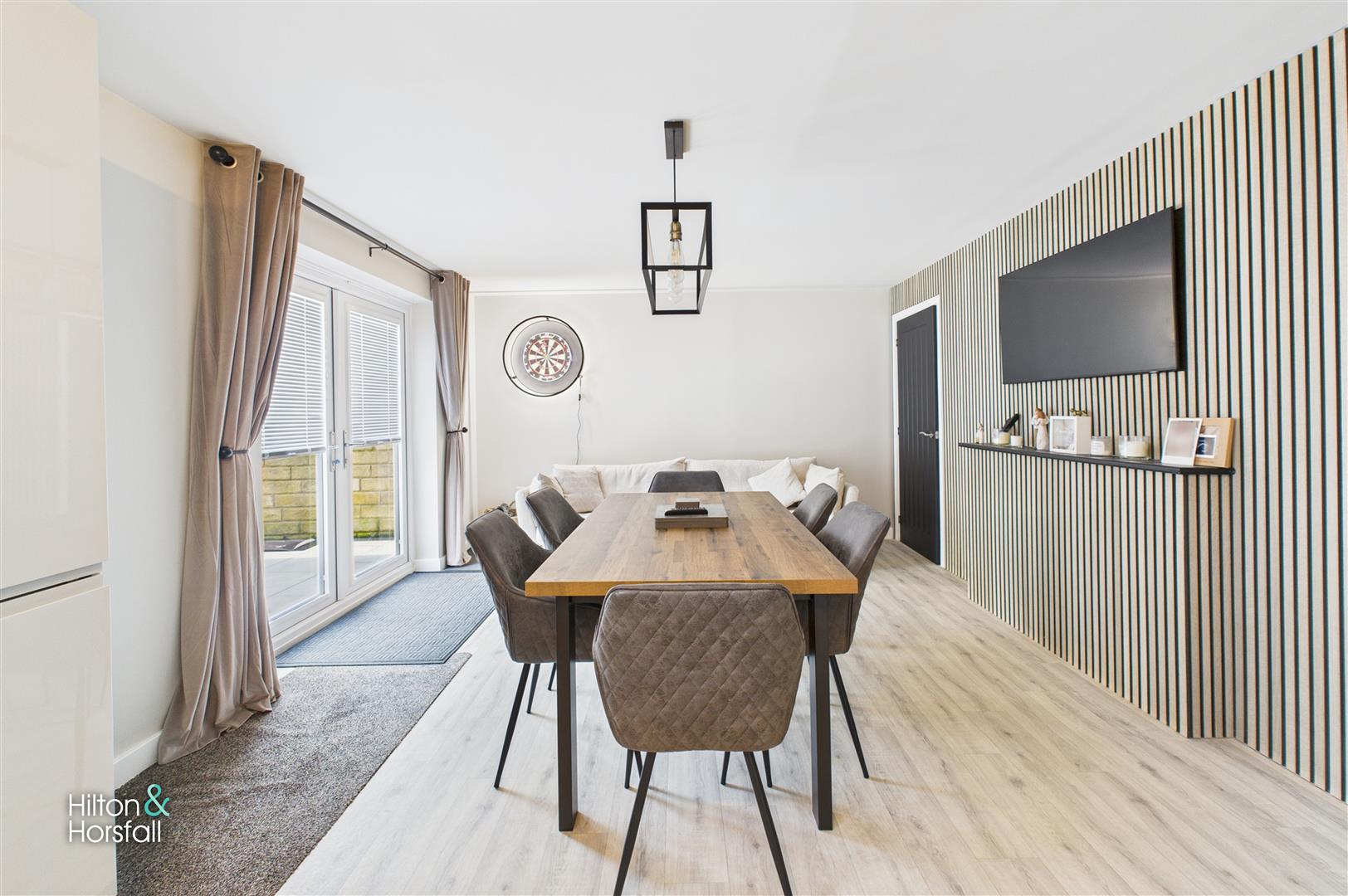 A stylish and versatile open-plan dining and sitting area, seamlessly connected to the kitchen to create an excellent hub for modern family living and entertaining. The space is finished with contemporary décor and wood-effect flooring, providing a cohesive flow throughout the ground floor. Double doors open directly out to the landscaped rear garden, allowing natural light to flood the room and creating a strong connection between indoor and outdoor living—ideal for summer entertaining. The room comfortably accommodates a dining table and seating area, with ample space for both relaxed family time and hosting guests, making it a standout feature of the home.