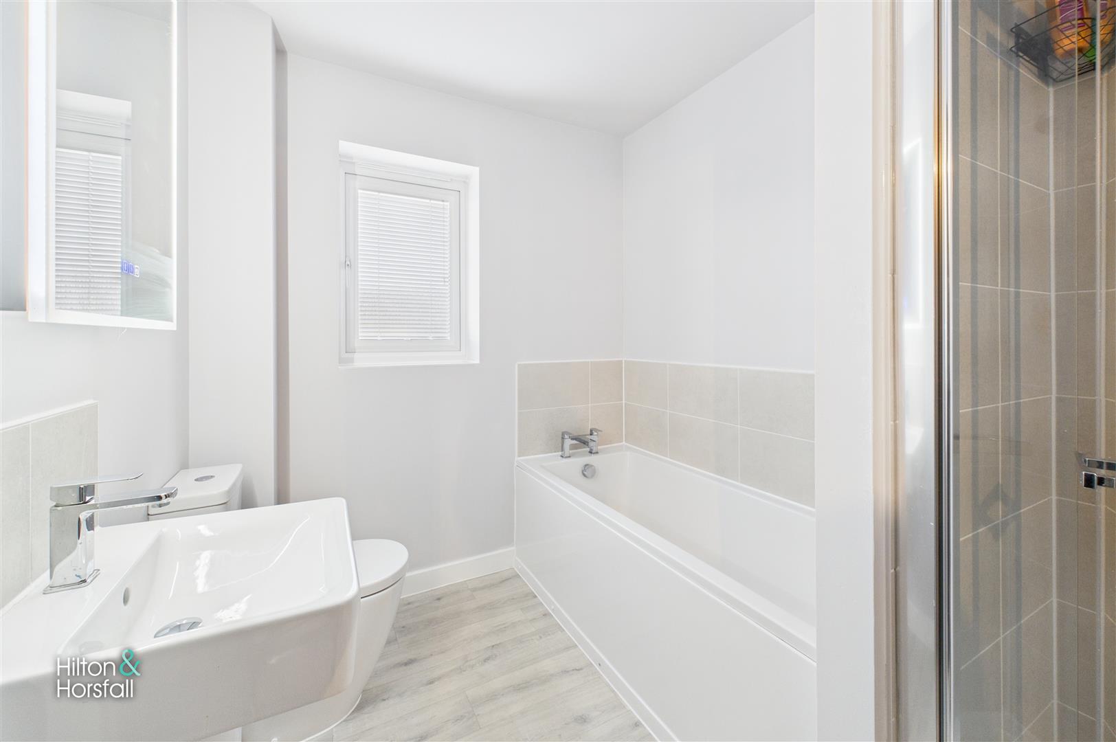 A modern and well-appointed family bathroom, finished in a clean, contemporary style. The suite comprises a panelled bath with chrome mixer tap, a separate shower cubicle, low-level WC and a sleek wash basin, all complemented by neutral tiling and wood-effect flooring. A window provides natural light and ventilation, making this a bright and practical bathroom space, well suited to the needs of a growing family.