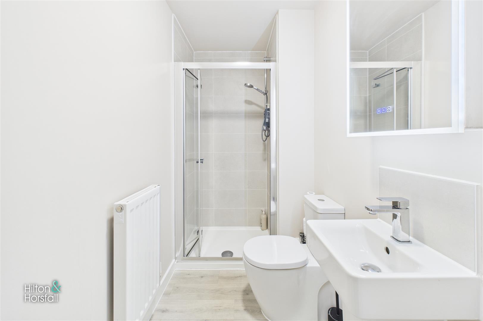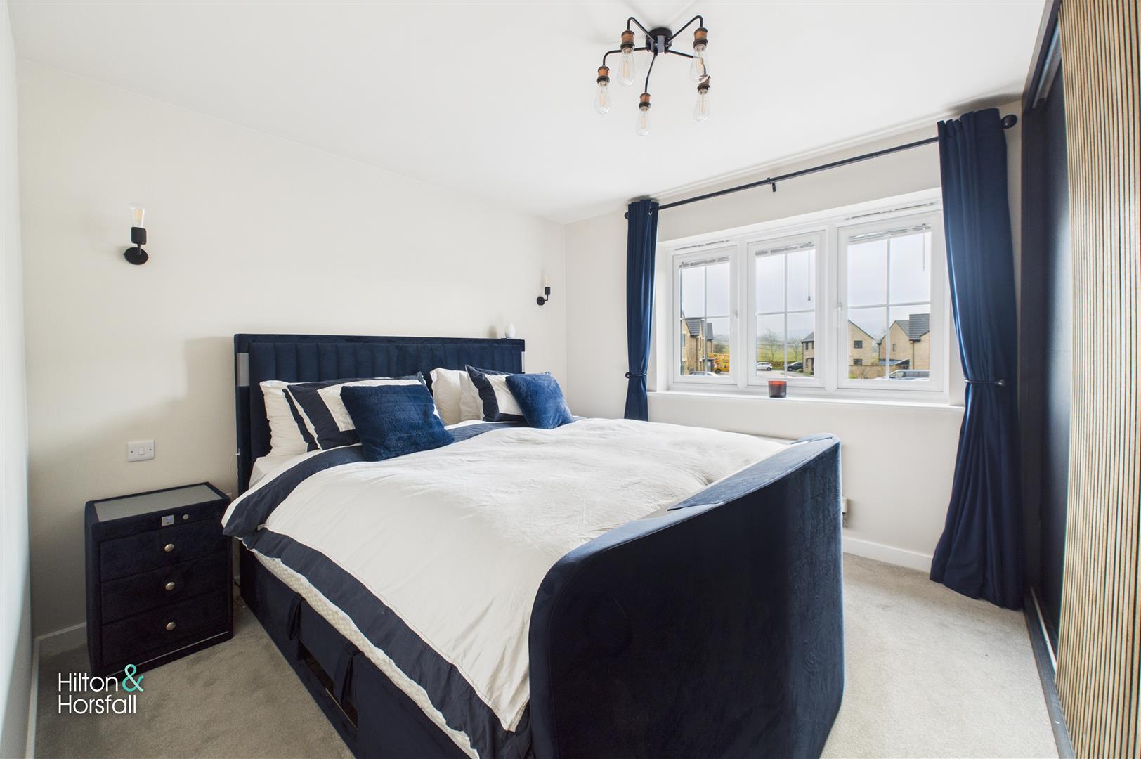 A generously sized and beautifully presented principal bedroom positioned to the front of the property. Finished in a calm, contemporary style with soft neutral décor and fitted carpeting, the room provides an inviting and relaxing retreat. A large front-facing window allows plenty of natural light to flow through the space, while inbuilt wardrobe storage with sliding doors offers excellent practicality without compromising floor space. The bedroom further benefits from direct access to a modern ensuite shower room, adding both convenience and privacy.