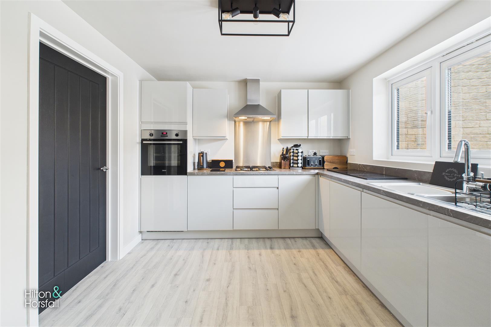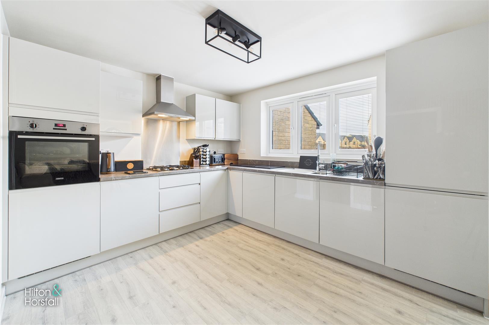 A sleek and contemporary kitchen forming part of the home’s impressive open-plan living space, perfectly suited to modern family life. The kitchen is fitted with a range of high-gloss wall and base units, complemented by contrasting work surfaces and a matching splashback, creating a clean and stylish finish. Integrated appliances include a built-in oven, gas hob with stainless steel extractor hood, and space for additional appliances, while a large window to the side elevation allows natural light to flood the room. The kitchen flows seamlessly into the adjoining dining area, making it an ideal space for everyday living, entertaining and family gatherings, all finished with practical wood-effect flooring that continues throughout the open-plan space.