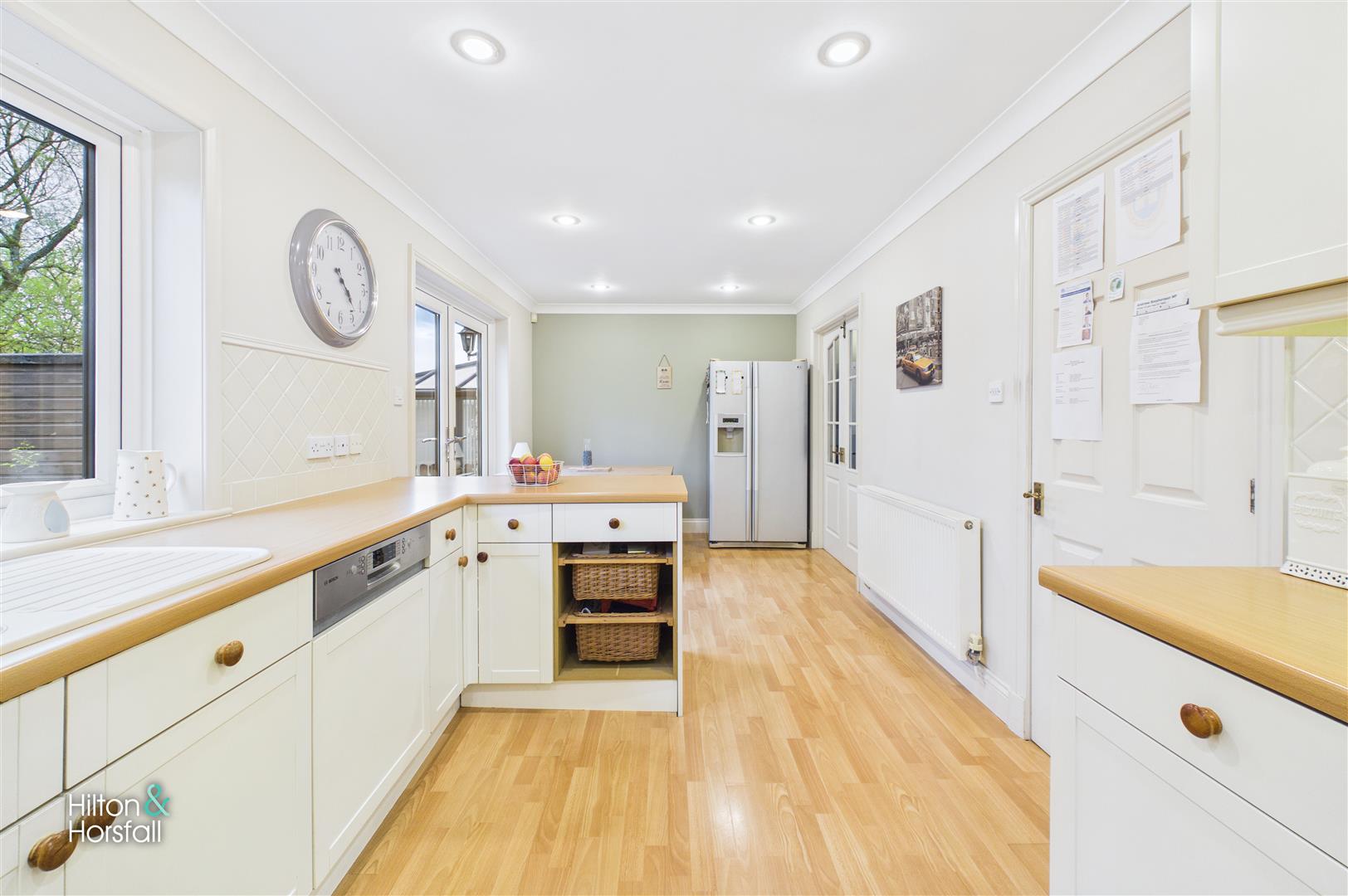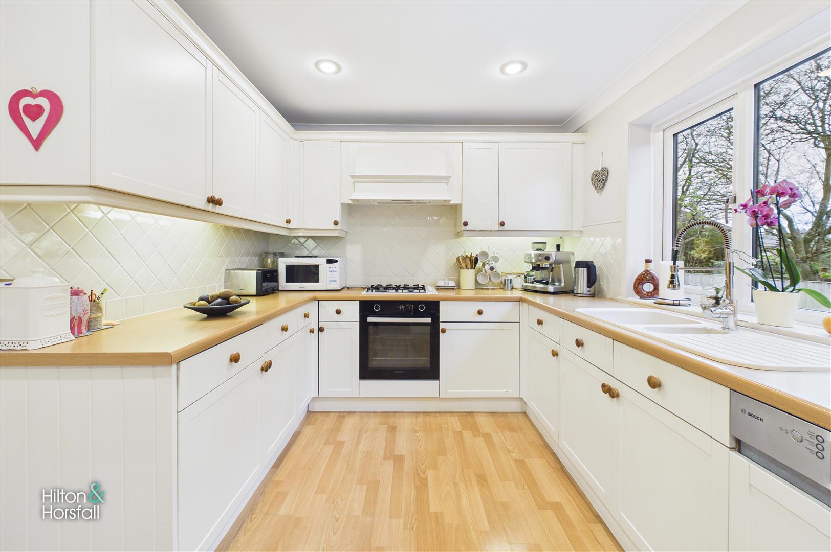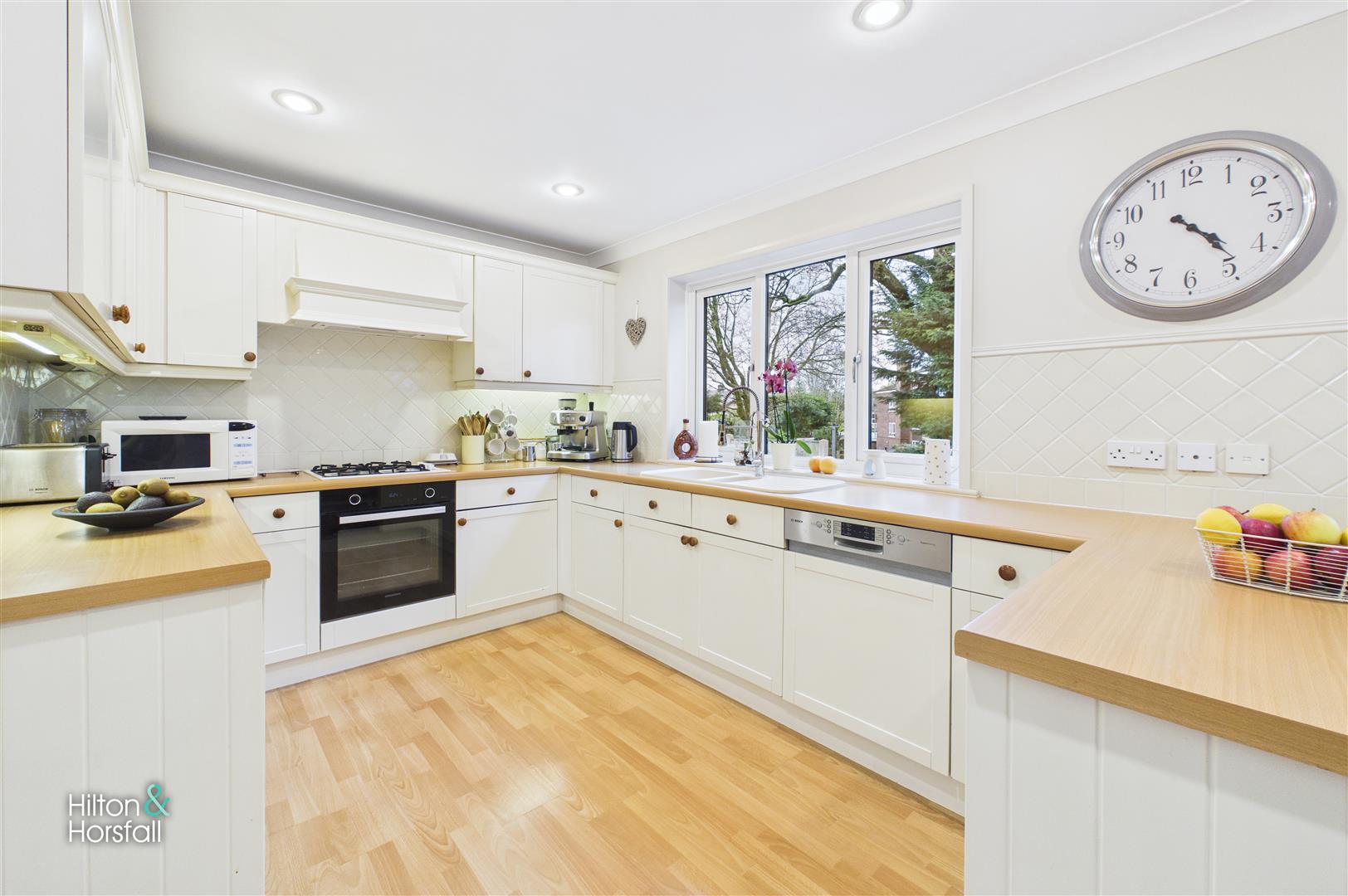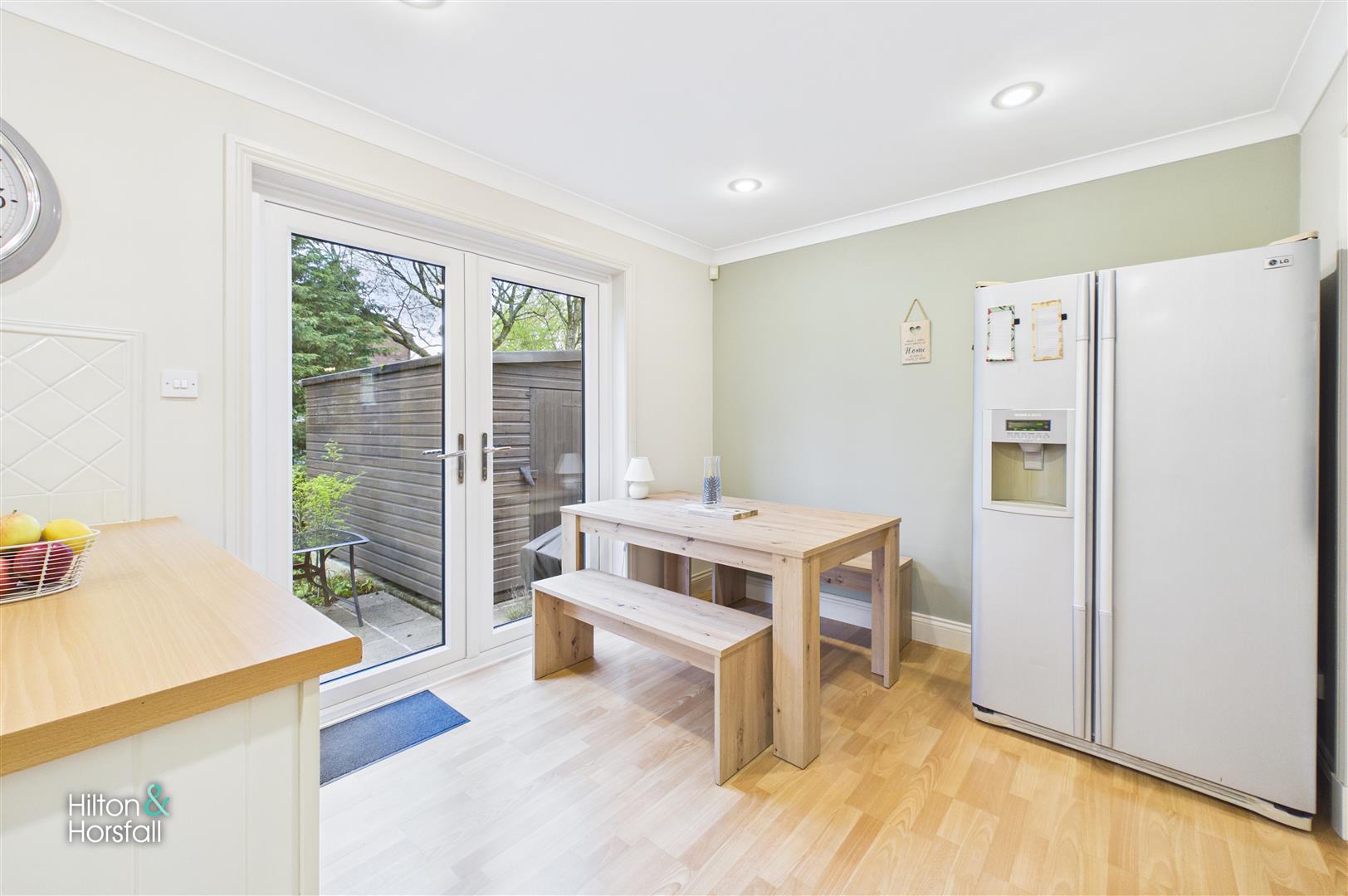 A spacious and well-appointed dining kitchen fitted with a range of matching wall and base units, complemented by wood-effect work surfaces and tiled splashbacks. The room offers ample space for a dining table, making it ideal for family living and entertaining, with French doors providing direct access out to the rear garden. Benefiting from integrated appliances, plenty of storage, and recessed ceiling lighting, this bright and airy space forms the heart of the home.