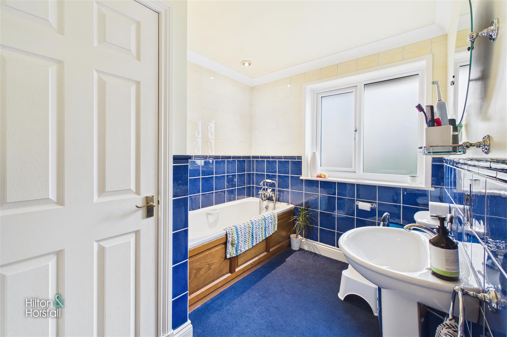 A well-proportioned family bathroom fitted with a three-piece suite comprising a panelled bath with shower over, low-level WC, and wash hand basin. The room is part tiled and benefits from a frosted window to the rear allowing for natural light, along with an airing cupboard providing useful storage.