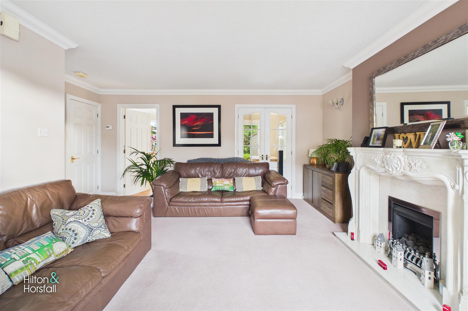 A spacious and beautifully presented living room offering ample space for furniture, centred around an attractive feature fireplace which creates a warm and inviting focal point. The room benefits from a large window allowing in plenty of natural light, along with neutral décor and double doors providing access through to the dining kitchen, making it ideal for both relaxing and entertaining.