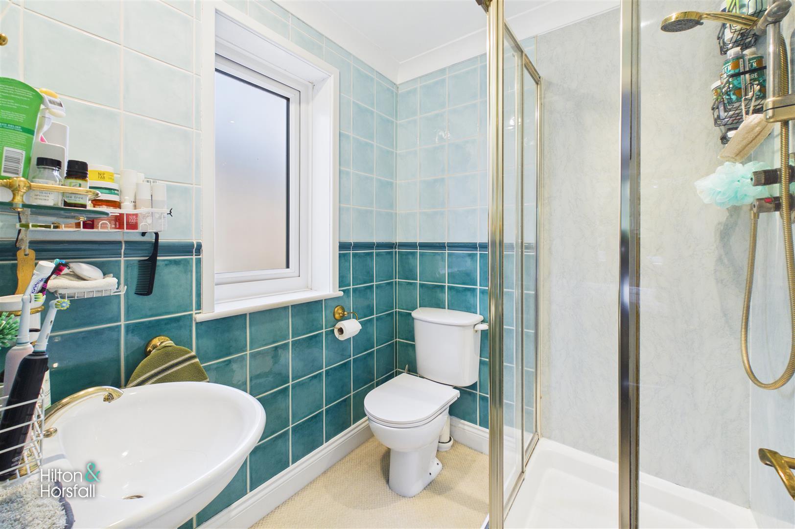 A well-appointed ensuite fitted with a three-piece suite comprising a walk-in shower enclosure, low-level WC, and wash hand basin. The room is fully tiled and benefits from a frosted window allowing for natural light while maintaining privacy.