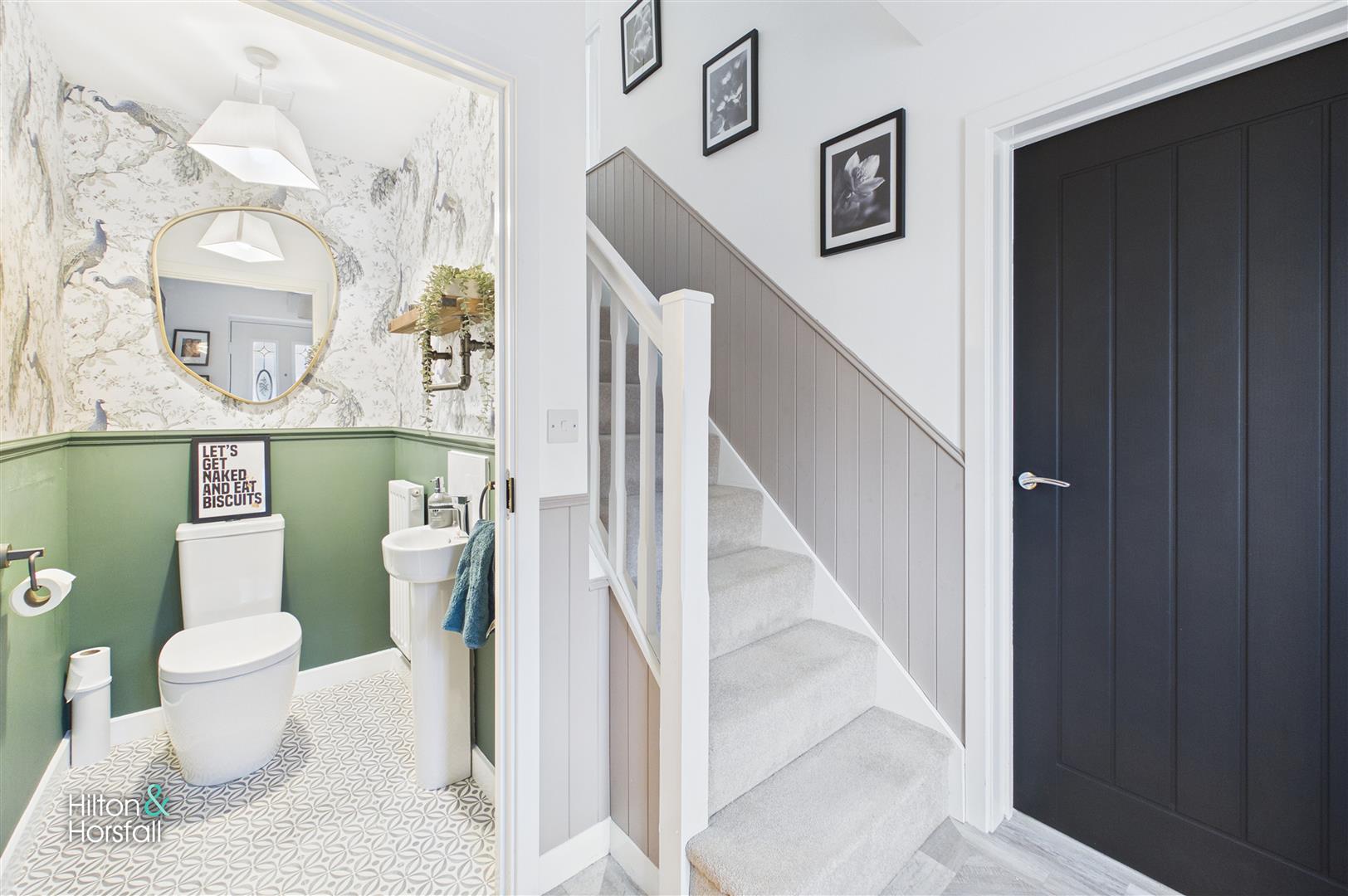 A beautifully presented ground floor WC fitted with a modern two-piece suite comprising a low-level WC and pedestal wash hand basin with mixer tap. The room is enhanced by stylish décor and complementary flooring, creating a contemporary yet characterful space. Perfectly positioned for guests and everyday convenience.