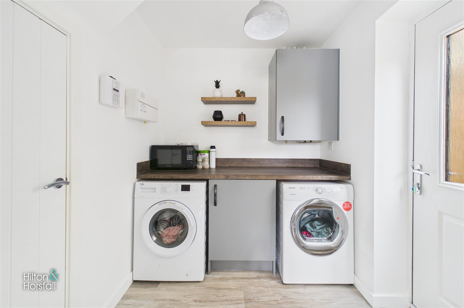 A practical and well-appointed utility room fitted with matching modern cabinetry and complementary work surfaces. The space provides plumbing and ample room for both a washing machine and tumble dryer, along with additional storage. A door opens directly onto the rear garden, offering everyday convenience and making this an ideal functional addition to the home.