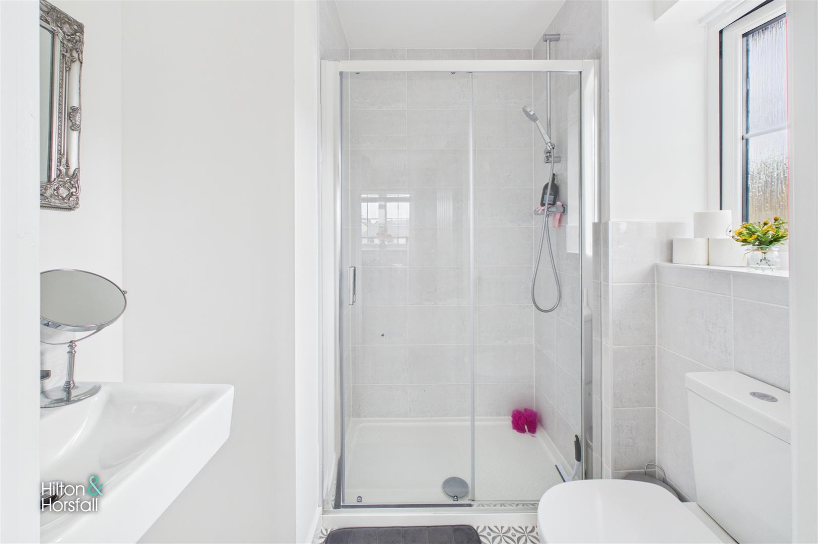 A modern and well-presented ensuite fitted with a stylish three-piece suite comprising a walk-in shower with glazed enclosure, low-level WC and wash hand basin. Finished with contemporary tiling and fittings, the room offers a clean and functional space designed for everyday comfort and convenience.