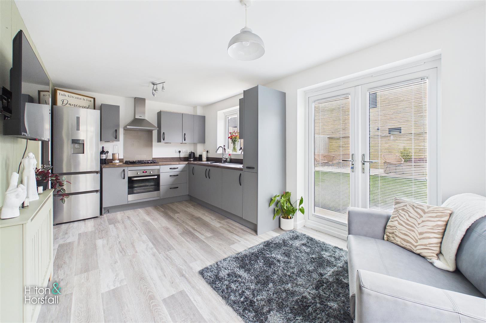 A stylish and contemporary dining kitchen fitted with a range of modern grey wall and base units complemented by contrasting work surfaces. The space incorporates a stainless steel sink with mixer tap, integrated oven with four-ring gas hob and extractor hood over, along with ample room for freestanding appliances. There is generous space for dining and soft seating, creating an ideal hub for everyday living and entertaining. Dual aspect windows allow for plenty of natural light, while French doors open directly onto the rear garden and patio, seamlessly blending indoor and outdoor living.