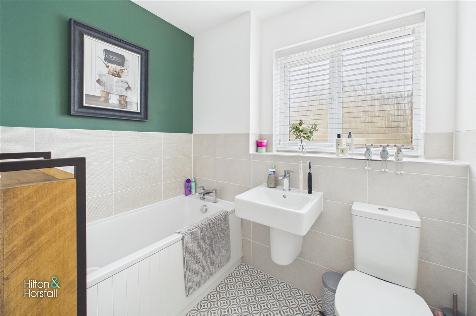A modern and stylishly appointed house bathroom fitted with a contemporary three-piece suite comprising a panelled bath with shower attachment, low-level WC and wash hand basin. The room is finished with attractive tiling and complementary flooring, creating a clean and comfortable space ideal for everyday use.