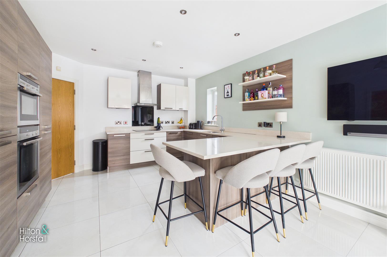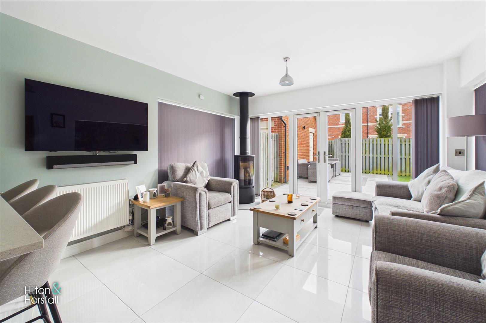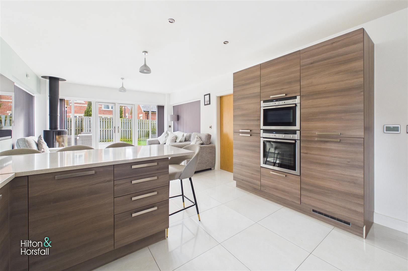 A superb open plan breakfast kitchen and living space forming the heart of the home, ideal for modern family living and entertaining. The kitchen is fitted with a range of stylish wall and base units with contrasting work surfaces, incorporating integrated appliances including double ovens, an induction hob with extractor above and an inset sink with mixer tap. A large peninsula unit provides additional preparation space and breakfast bar seating, while the room flows seamlessly into the living area with windows and French doors opening out to the rear garden and patio. A contemporary freestanding multi-fuel stove creates a lovely focal point, making this a fantastic space to relax or entertain all year round.