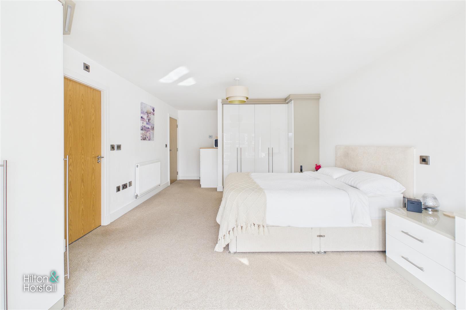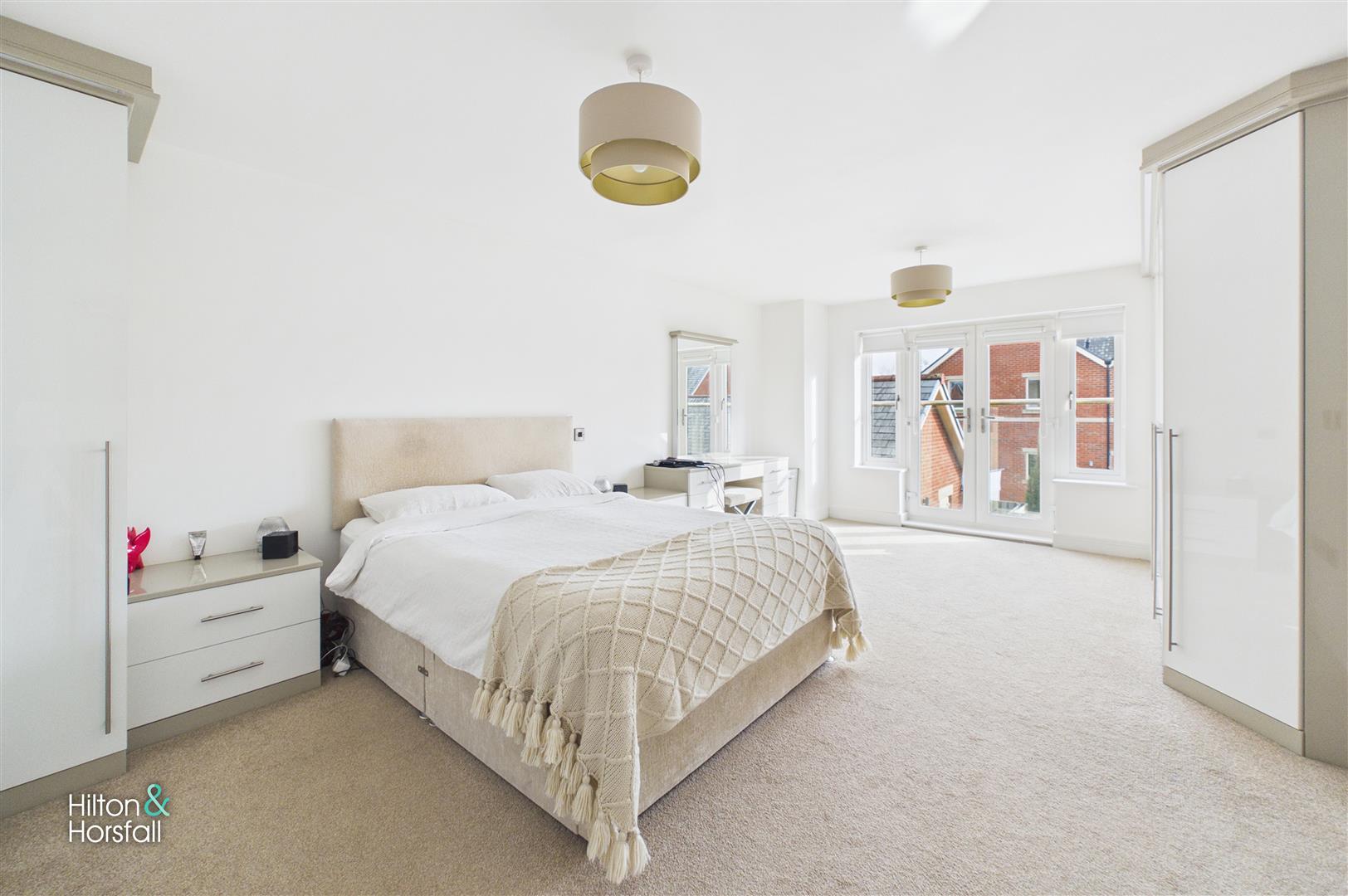 A spacious double bedroom positioned to the rear of the property, offering a bright and relaxing space with French doors and a Juliet style balcony allowing plenty of natural light to fill the room. The bedroom benefits from fitted wardrobes providing excellent storage and also enjoys direct access to a private ensuite shower room.