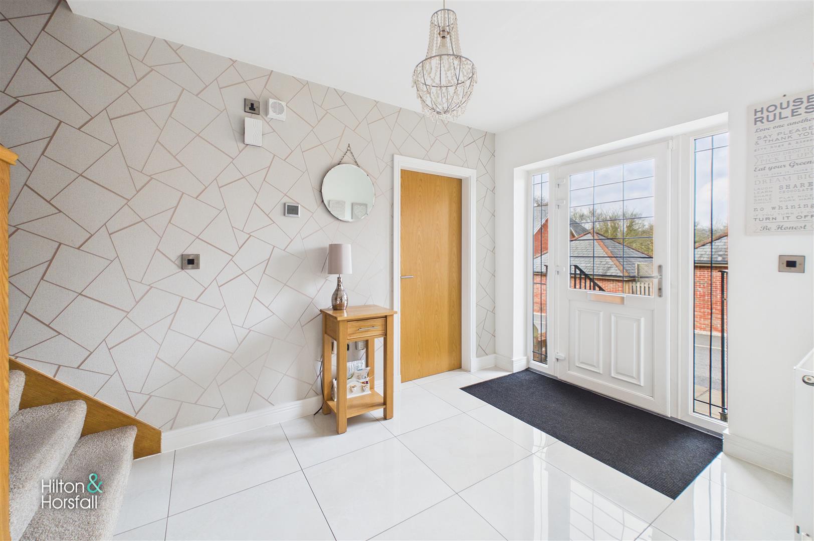 A welcoming and spacious reception hallway with a front door and full-height glazed side panels allowing plenty of natural light to flow through. Finished with sleek tiled flooring and a stylish feature wall, the hallway creates an impressive first impression and provides access to the living room, sitting / dining room, breakfast kitchen / living area, ground floor WC and staircase leading to the first floor.