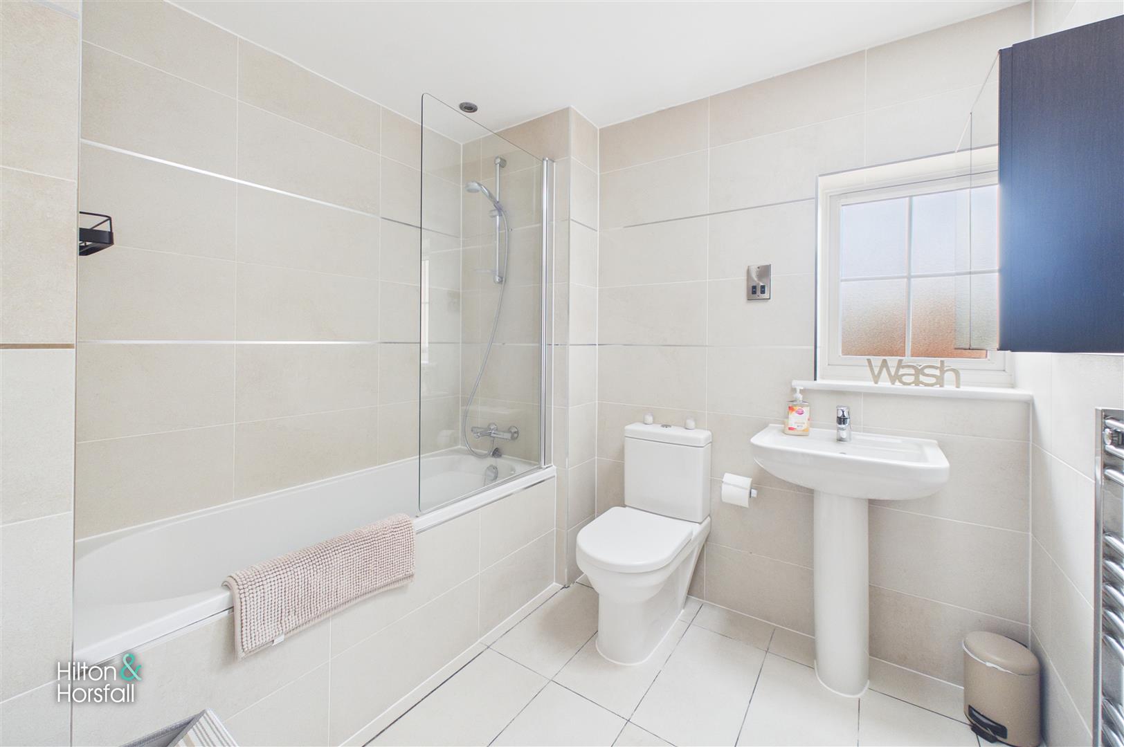 A modern three-piece bathroom suite comprising a panelled bath with shower over and glass screen, low level WC and pedestal wash basin with chrome mixer tap. The room is finished with contemporary tiled walls and flooring and benefits from a frosted window to the front allowing for natural light while maintaining privacy.