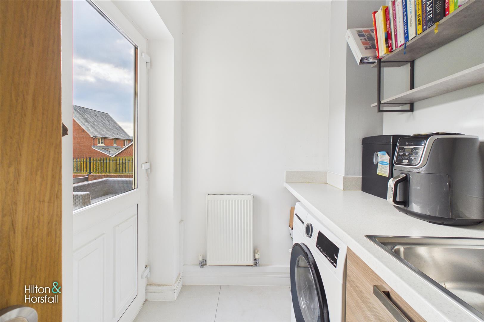 A useful and practical utility room fitted with additional worktop space and a stainless steel sink with mixer tap. The room provides plumbing for a washing machine and space for further appliances, along with a door leading out to the rear garden, making it ideal for everyday household use.