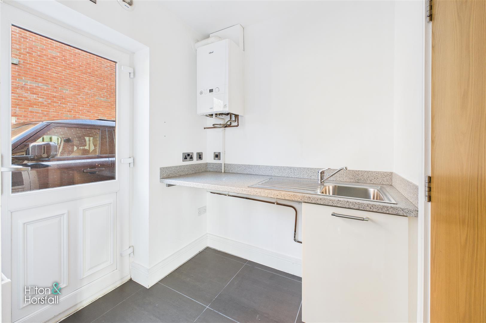 A practical utility room fitted with work surfaces, sink and plumbing for appliances, with an external door providing additional access to the side of the property.