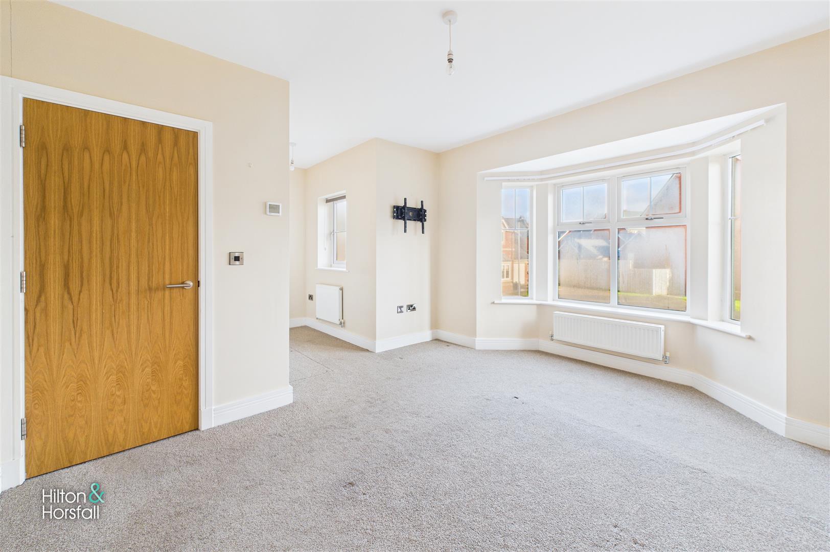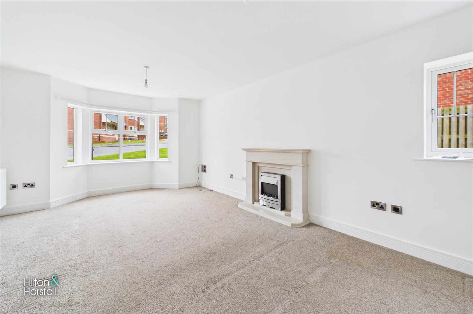 A spacious and light-filled living room featuring a bay window to the front elevation and a central fireplace with surround. Finished in neutral décor with fitted carpeting, this room offers a comfortable and versatile space for everyday family living.